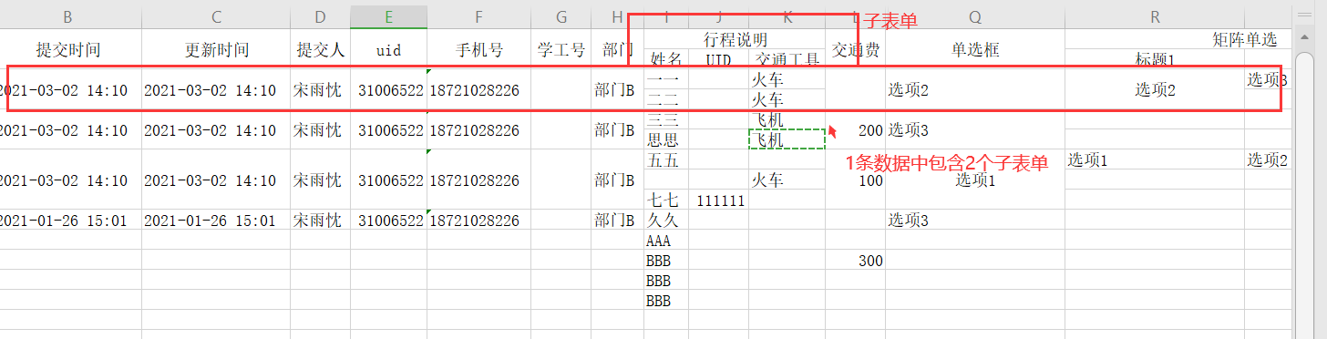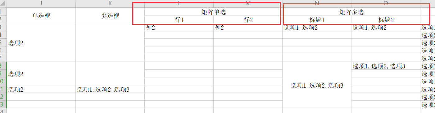 ⑤矩阵单选,矩阵多选:每个矩阵单选、矩阵多选类似一个子表单,矩阵的行类似子表单标题,矩阵的列数据导入相应的行数据下。同一个表单中既有矩阵字段又有子表单时,矩阵数据导入第一行或合并单元格。