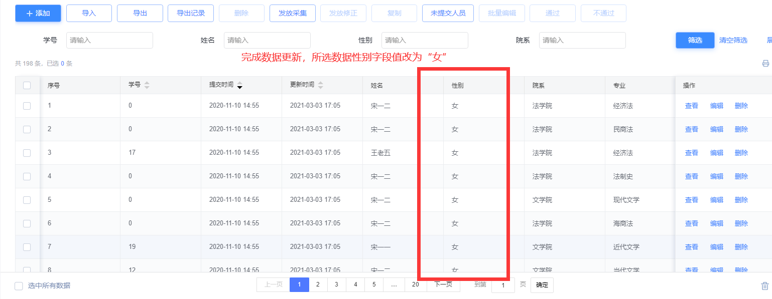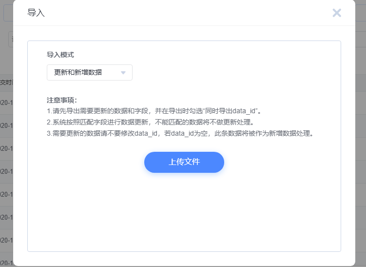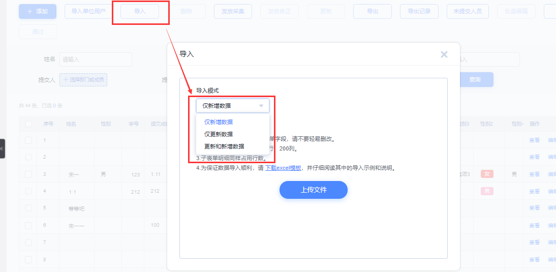 点击表单上方“导入”按钮,有3种导入模式可供选择:仅新增数据,仅更新数据,更新和新增数据。