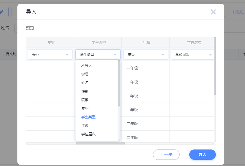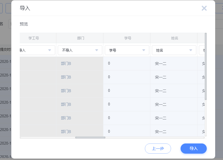 文件上传后,在预览页面进行导入字段确认,系统默认匹配,也可选择不导入或导入其他字段。