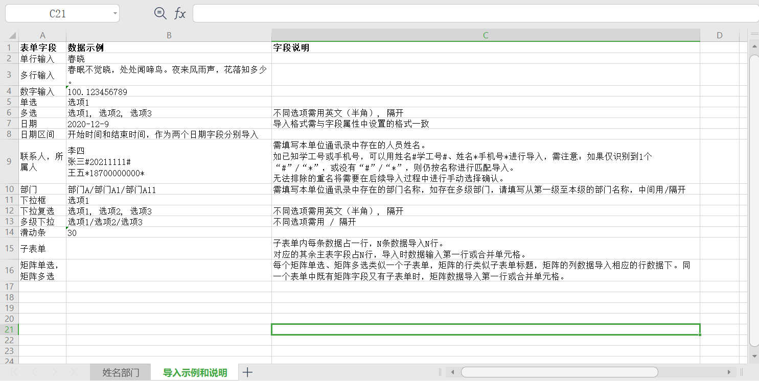 ①子表单:子表单内每条数据占一行,N条数据导入N行。对应的其余主表字段占N行,导入时数据输入第一行或合并单元格。