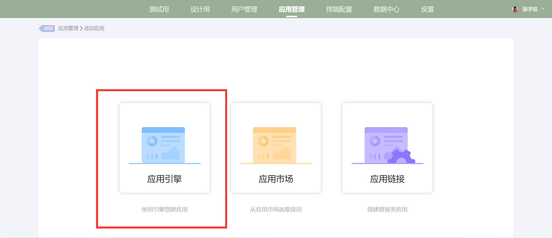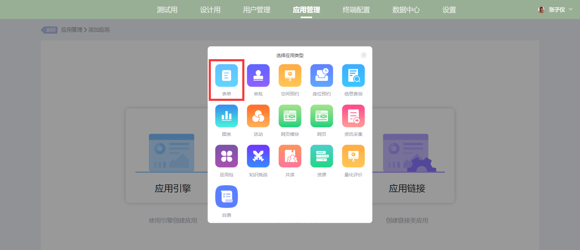 登录微服务后台,选择应用管理,点击“添加应用”,选择“应用引擎”—“表单”: