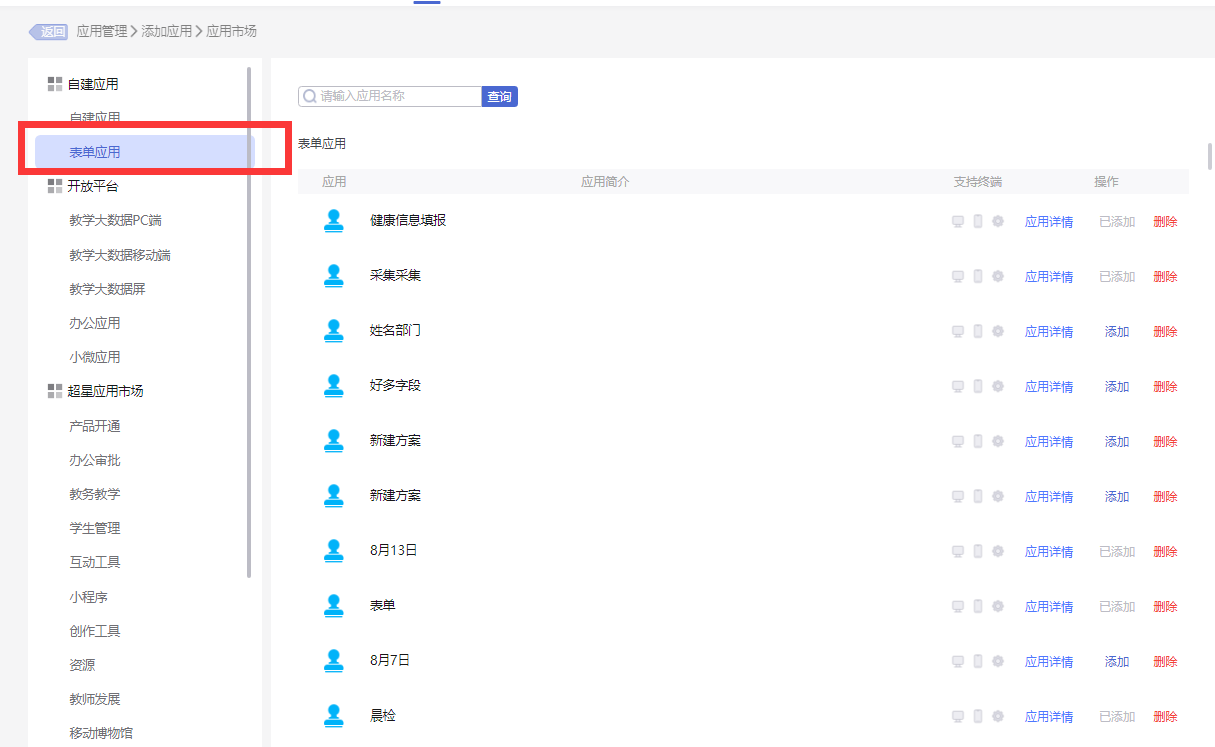 ①创建成功之后都会进入单位应用市场-自建应用-表单应用分类下: