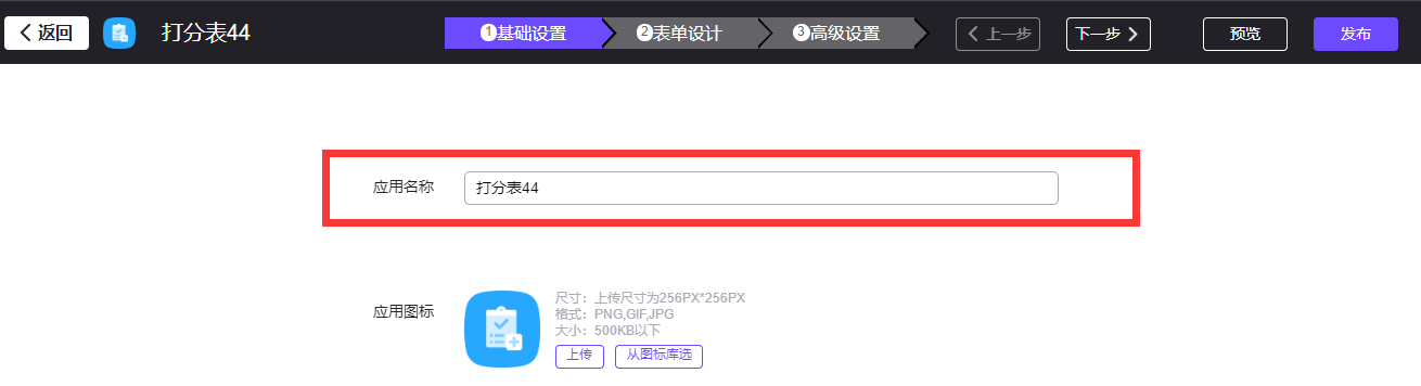 从应用管理中创建表单应用时必须在第一步基础设置中填写应用名称(否则无法保存)。