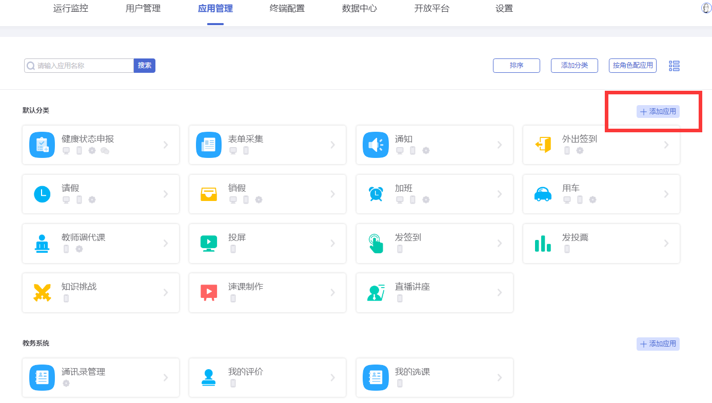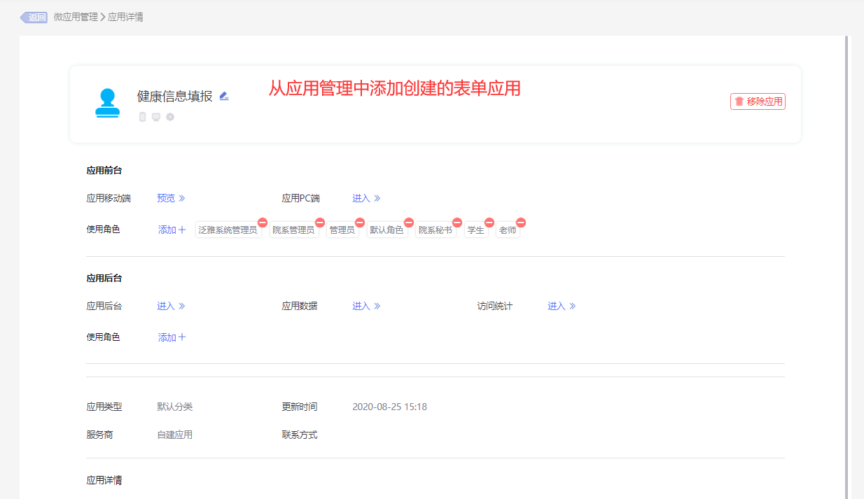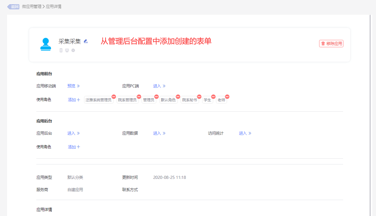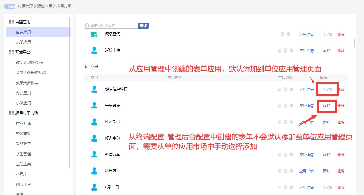 ③从应用管理中创建的表单应用将默认添加至单位应用管理页面中,从管理后台配置中创建的表单(应用)只默认添加于单位应用市场,如需在创建该表单的后台之外使用、需要从单位应用市场中手动选择添加至单位应用管理页面中:
