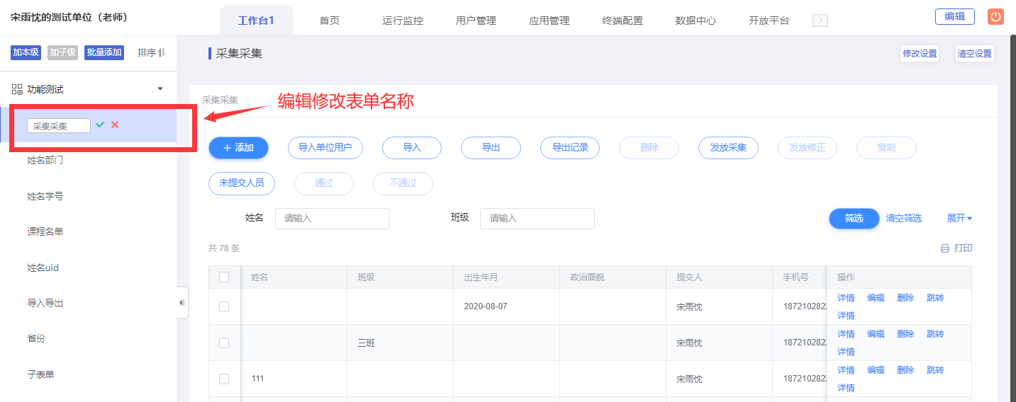从管理后台添加的表单,在后台配置时可在菜单处编辑修改表单名称。在菜单处编辑的名称会同步修改应用管理中显示的应用名称,但直接从应用管理中修改的名称不会同时修改管理后台的菜单名称。