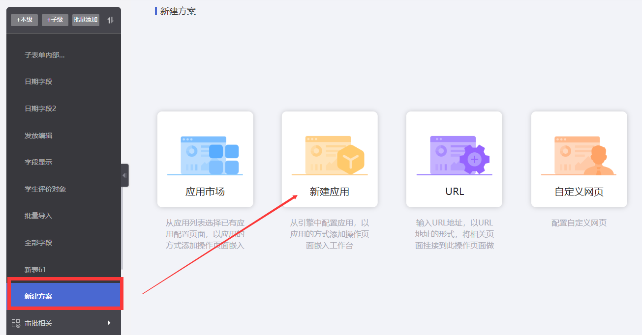 菜单处建的表单,默认名称为新建方案,可以在菜单处编辑修改,修改后的名称同步显示为应用市场中该表单应用的名称:
