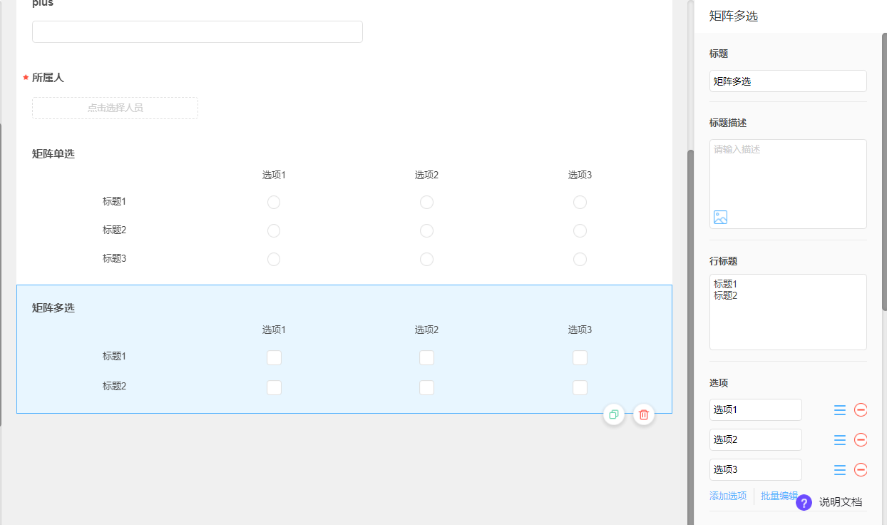 2.选项:默认3项。点击“添加选项”可增加一项。点击“批量编辑”可将已在别处编辑好的选项直接复制粘贴过来(一项一行)。