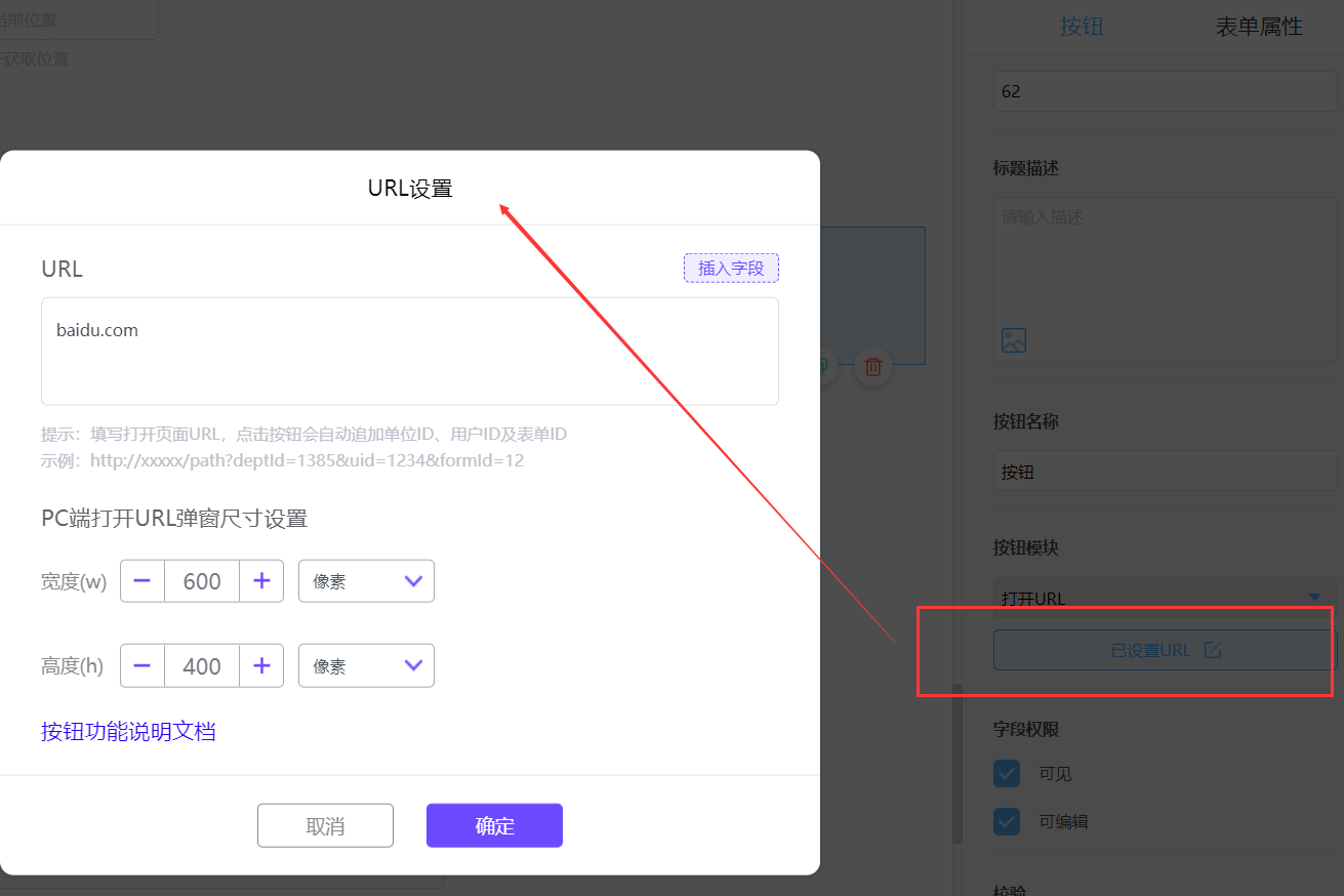 点击按钮时弹窗打开所设置的url。用户关闭弹窗后,页面显示出协议返回的值。