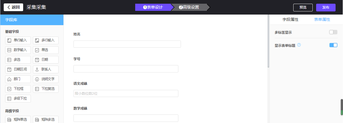 对表单整体属性的一些基本设置。目前支持多标签显示和表单标题显示设置