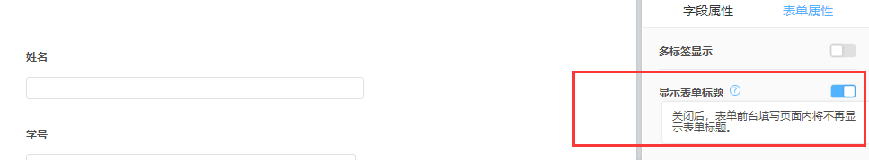 显示表单标题:默认开启,关闭后,表单前台填写页面内将不再显示表单标题。