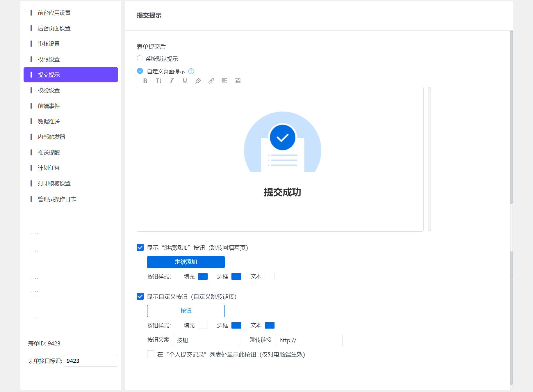 勾选自定义页面提示后,可在出现的富文本编辑器中编辑自定义提示内容。默认选中显示“继续添加”按钮(跳转回表单填写页),并可以设置显示自定义按钮(自定义跳转链接)。