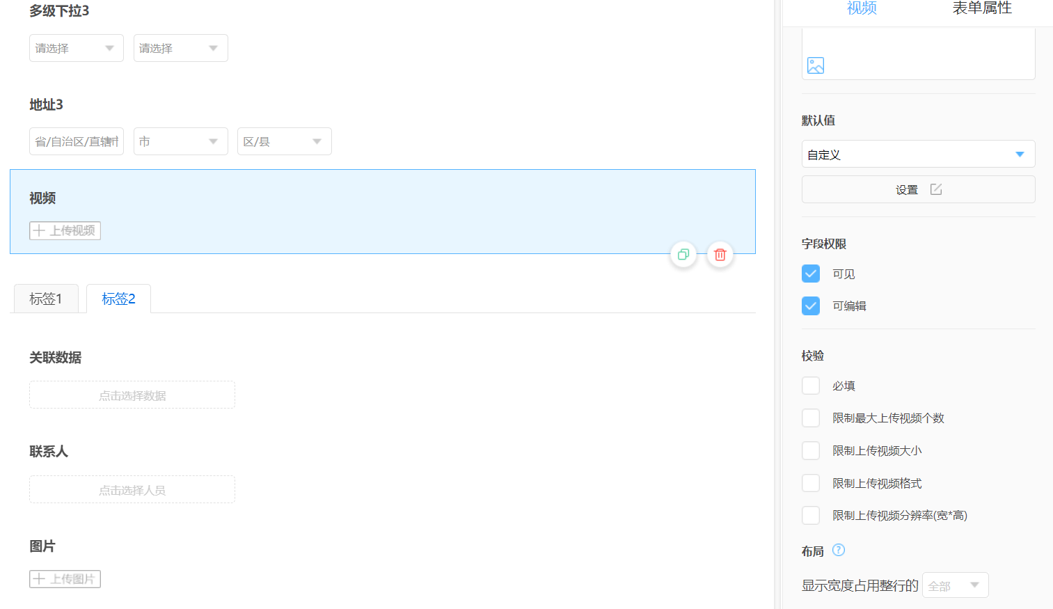 1.默认值:可选择自定义、数据联动(联动其他表单内的视频字段)。