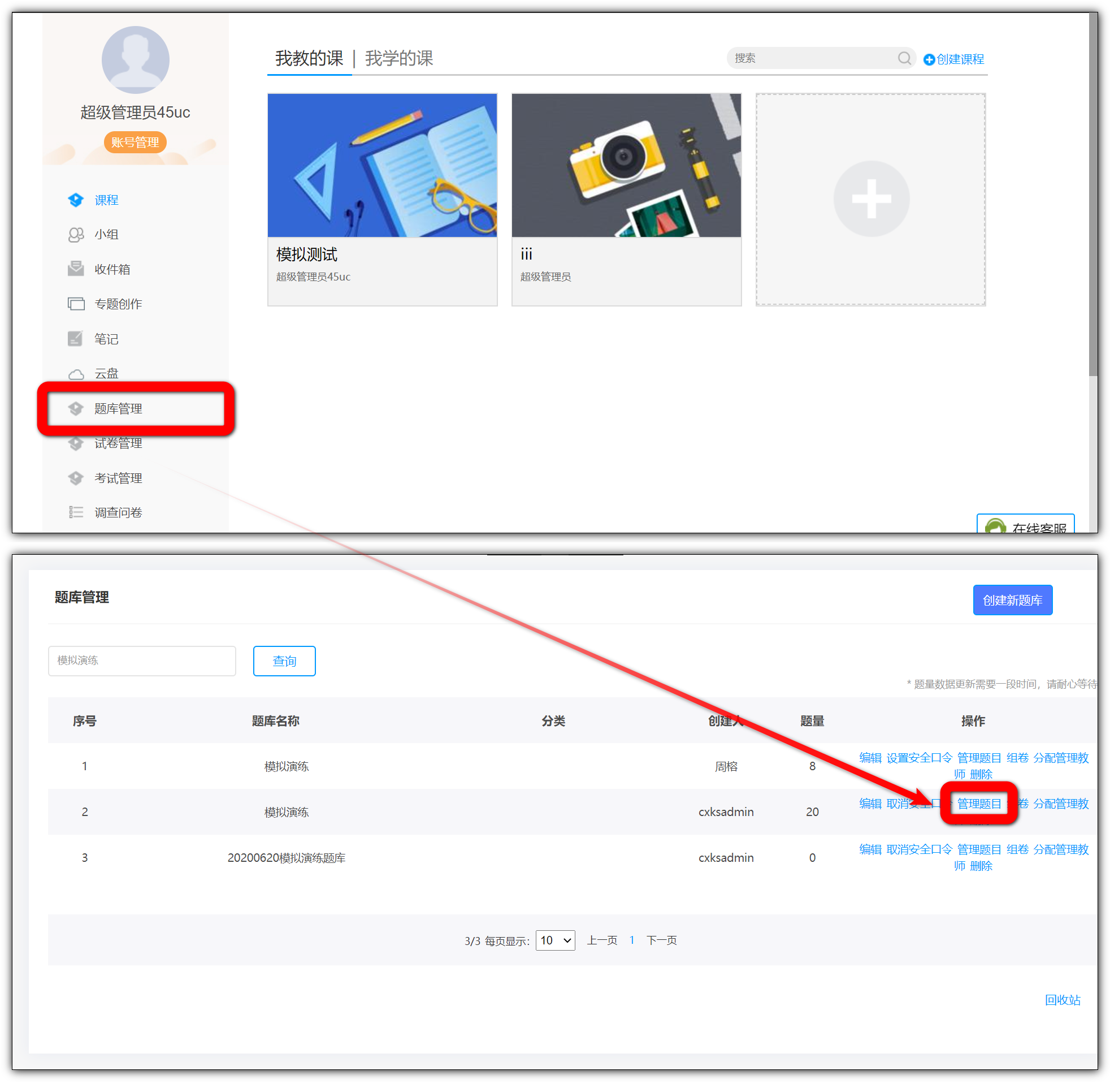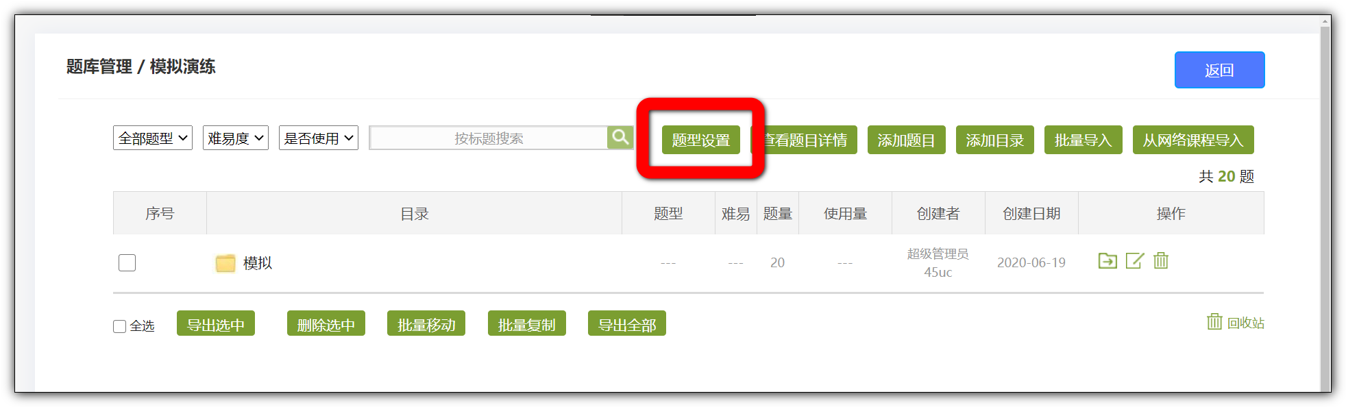 超星提供的18种题目类型的名称不一定符合各门学科的口味,如何让对的题型拥有对的名字呢?其实很简单,只需要进入“题目管理”页面,如下图所示: