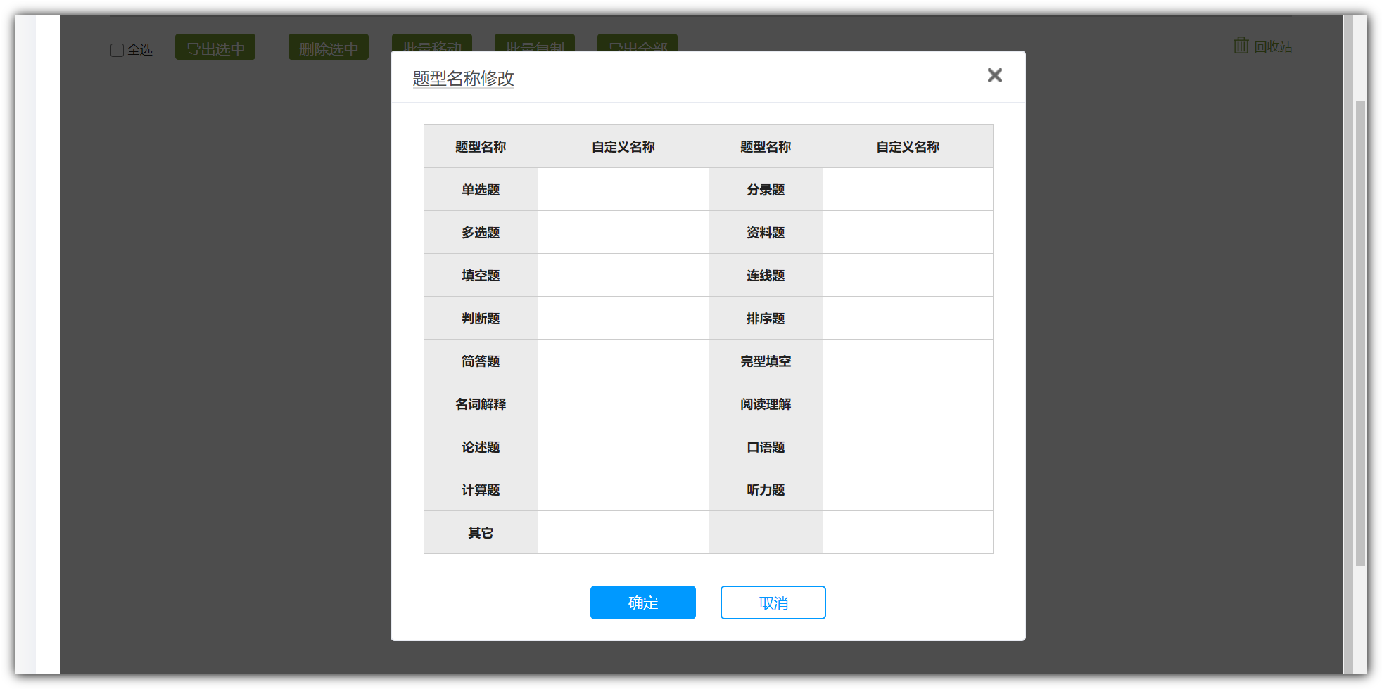 点击“题型设置”,打开如下窗口,在打开的窗口中自定义对应题型的名字即可!