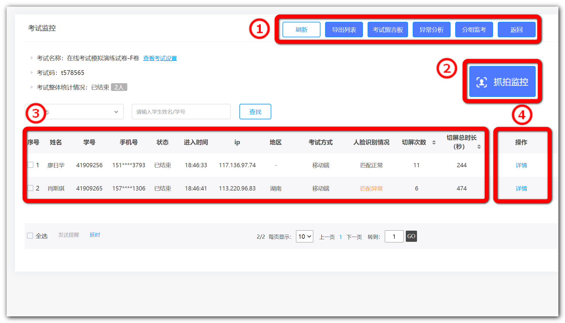 异常分析:自动筛选呈现本场考试所有异常信息;