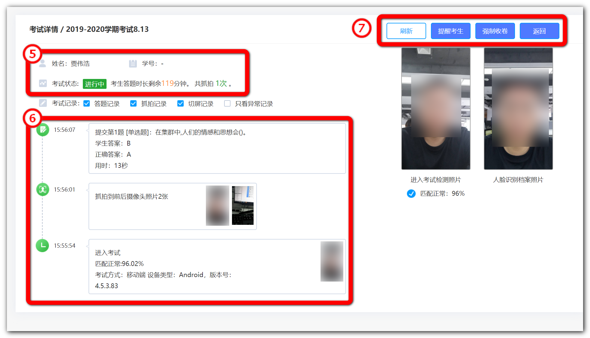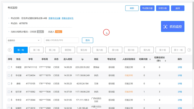 ⑥在线监控信息,包括:学生的作答记录、切屏记录、抓拍记录等,可在顶部筛选查看不同信息;
