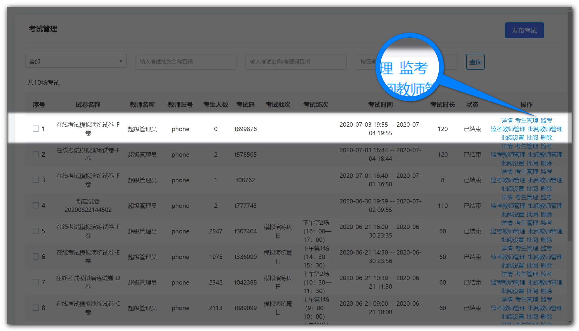 进入“考试列表”,在对应考试后点击“监考”: