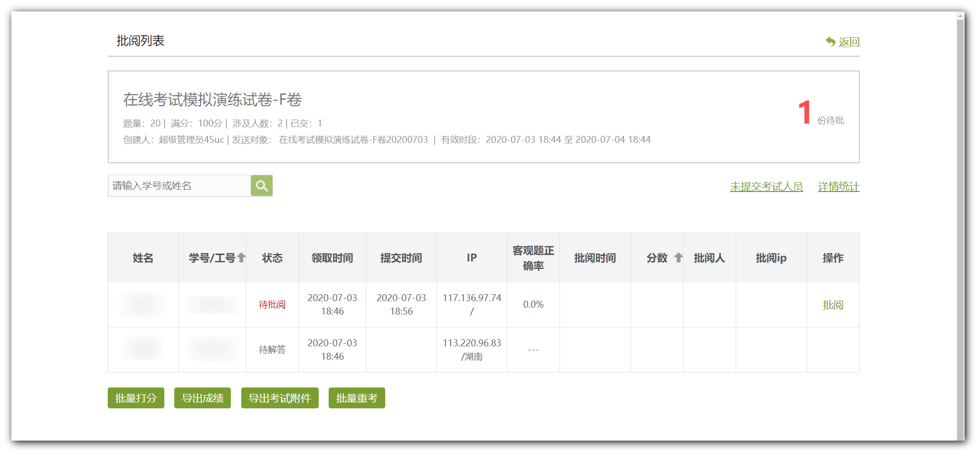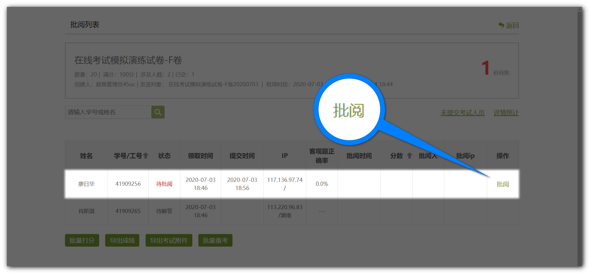 进入批阅列表后,点击对应考生后的“批阅”按钮,即可批阅该生试卷。