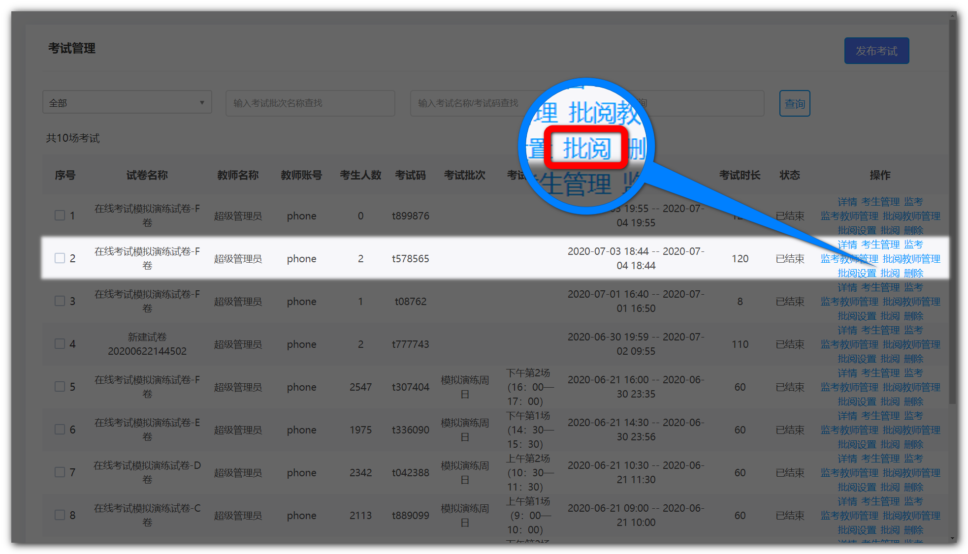 进入考试列表后,在要批阅的考试后点击“批阅”: