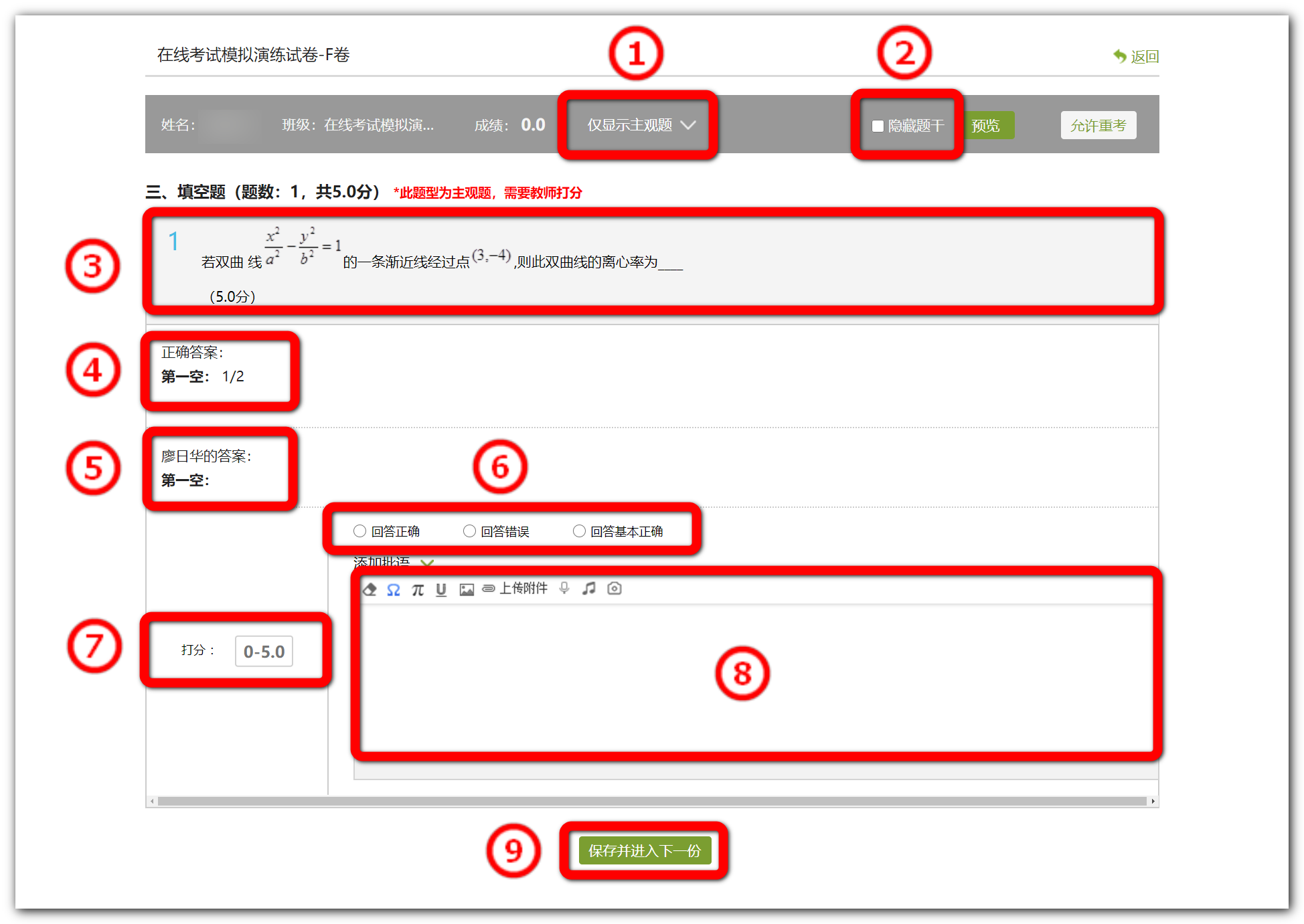 ⑨完成批阅后,可以点击“保存并进入下一份”继续批阅其他考生试卷。