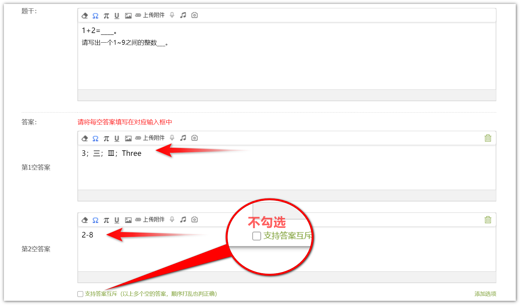 注意:必须设置足够的空数(至少一空),否则学生没有作答区域!将影响考试正常进行!!!