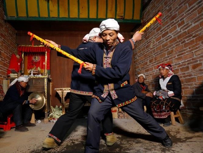 主要用于度身仪式。一般由2人或4人同舞,并配2名锣鼓手。舞者手执铜铃、龙杖,主要动作有起蹲左右摇舞铜铃,或舞者同向环绕中心而舞,时而相互对舞,最后一字排开行拜礼舞毕。