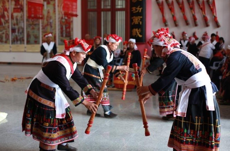 由3男3女组成,先由一男子手执铜铃站中央,其他人围绕其欢快起舞,接着男女手拉手围成圈,时而上下跳跃,时而来回旋转并高声吹叫,气氛热烈,表示对祖先恩赐的感激之情。