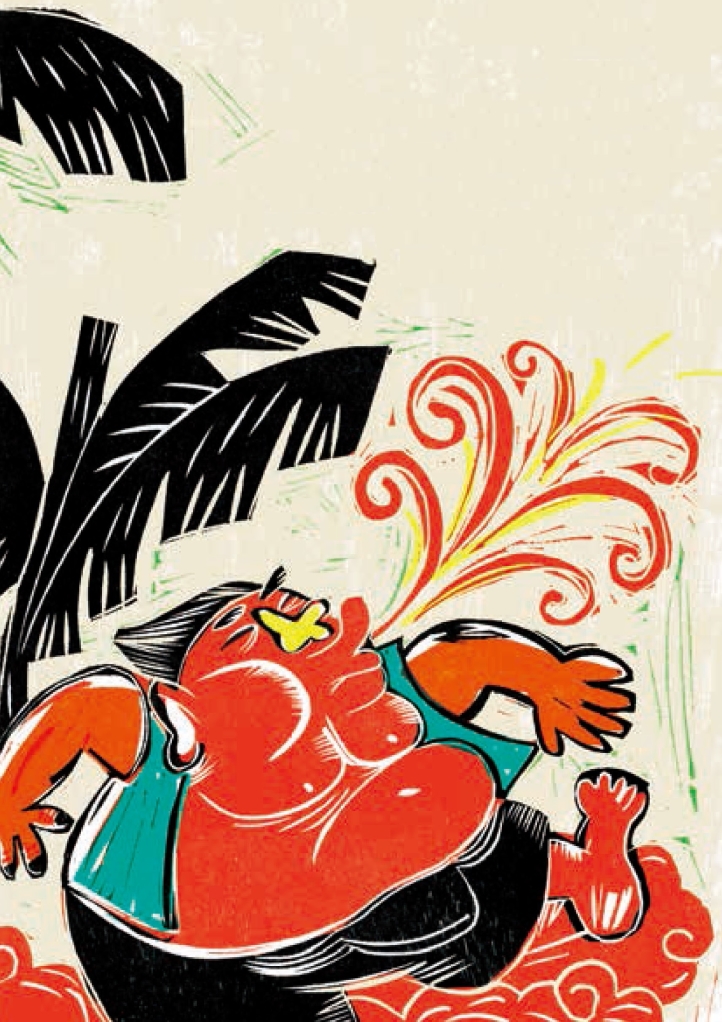 灶王爷扭头一看,一个超级大胖子坐在旁边的大芭蕉树下。说他是超级大胖子一点儿也不过分,灶王爷活到这把年纪,还是第一次看到这么胖的人,他坐在那里,一个人占了三四个人的位置。灶王爷不由得仔细打量他,发现他脸蛋子上的肉和脖子上的肉连在一起,分不清哪儿是哪儿,本来就不算大的一双眼睛眯成了一条缝,就像用刀片不经意间轻轻地划了一下似的,看不到里面的黑眼珠。灶王爷歪着头研究了他半天,硬是没明白他的眼睛看向哪儿。