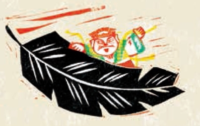 灶王爷惊讶地看到,风神刚刚说完,芭蕉叶立刻长成了和灶王爷一样高的芭蕉船。风神微笑着对灶王爷说:“你尽管放心趴上去吧!”说完一松手,灶王爷就掉在了芭蕉船上。