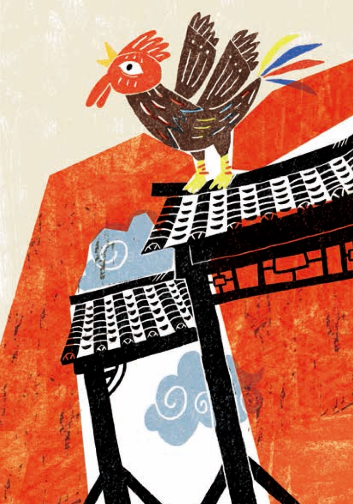 灶王爷刚想上前拍醒土地爷,大公鸡抢前一步,毫不客气地在土地爷的脑门儿上轻轻啄了一口。