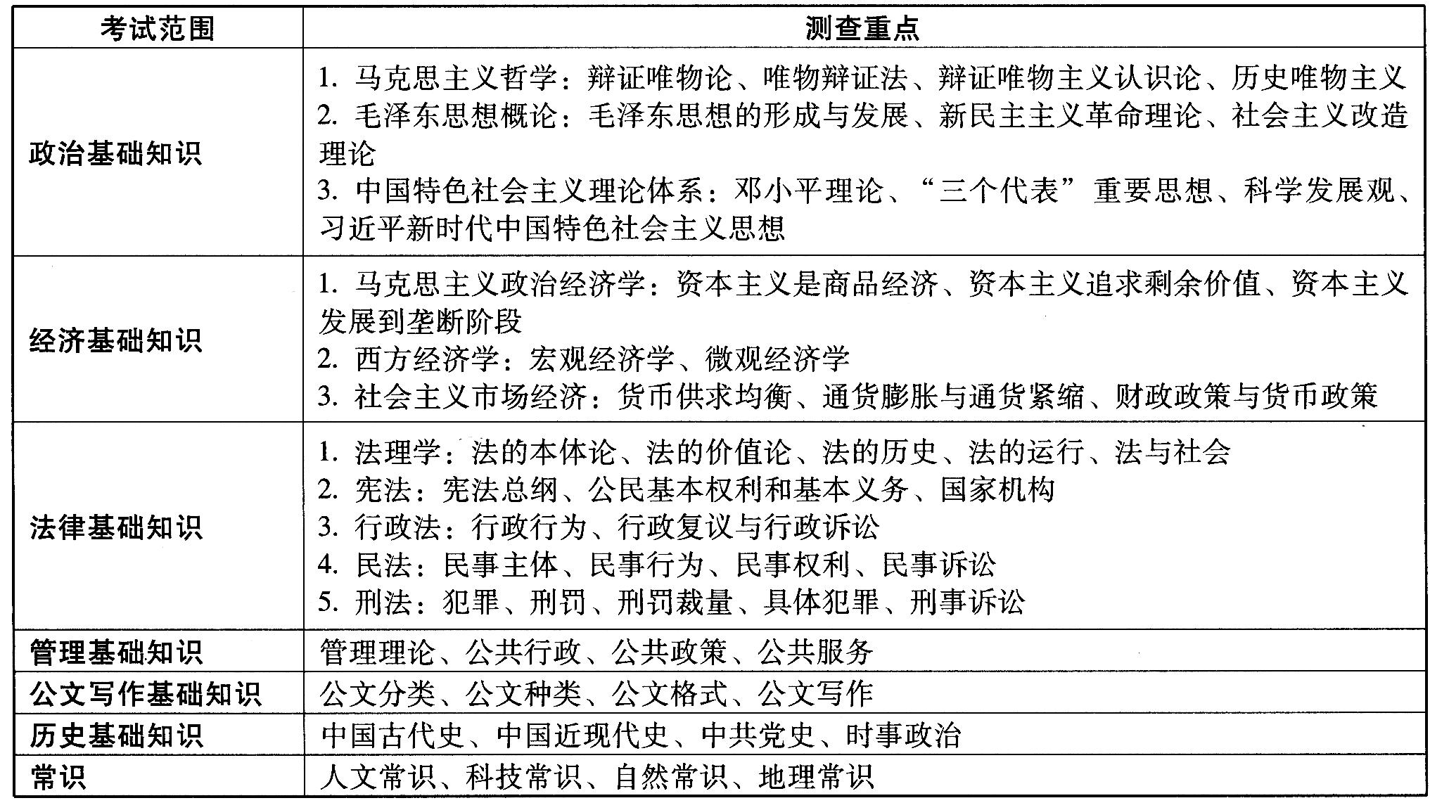 考试范围包括政治基础知识、经济基础知识、法律基础知识、管理基础知识、公文写作基础知识、历史基础知识、常识及时政省情知识等。公共基础知识考试范围和各部分测查重点如下表: