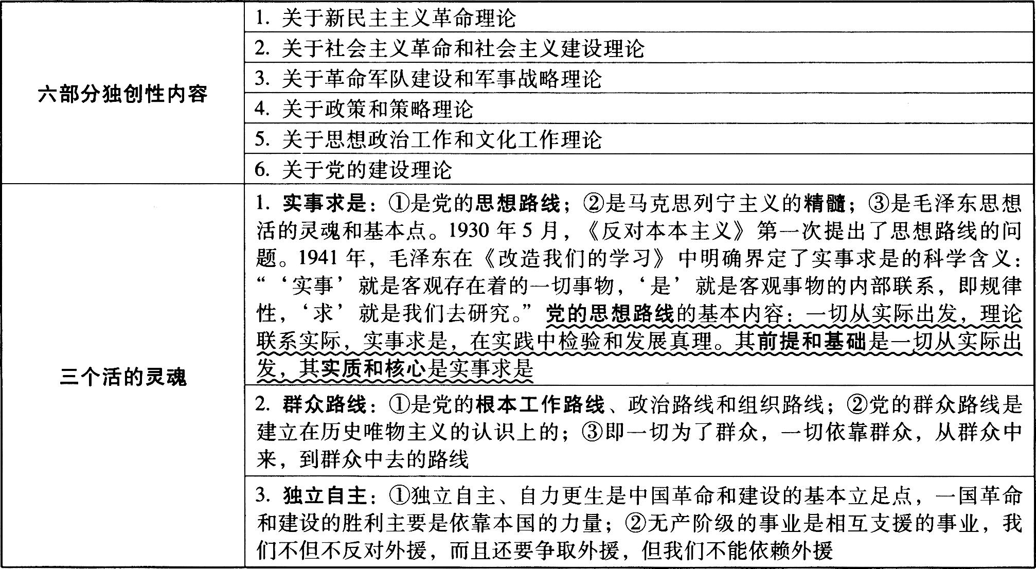 毛泽东思想的科学体系包括六部分独创性内容和三个活的灵魂: