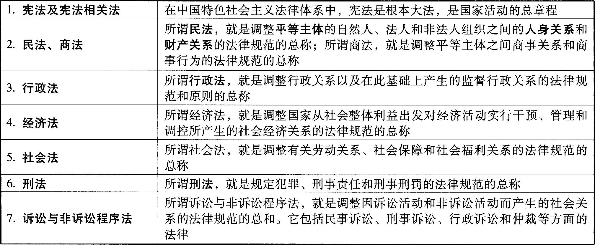 所谓中国特色社会主义法律体系,就是指以宪法为核心的中国特色社会主义法律体系,包括七个主要的法律部门:宪法及宪法相关法、民法商法、行政法、经济法、社会法、刑法、诉讼与非诉讼程序法。