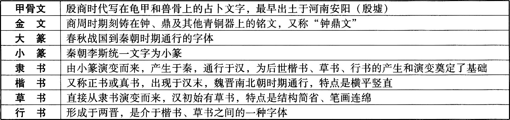 甲骨文、金文、大篆、小篆、隶书、楷书、草书、行书。
