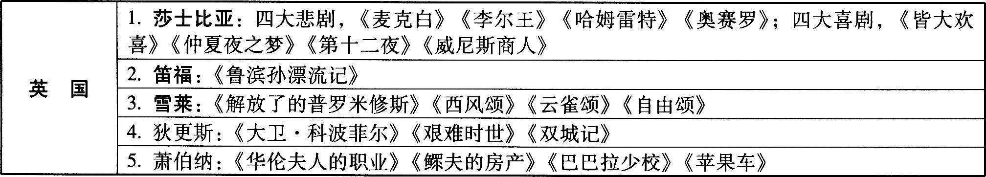 2.英国文化:英语、白金汉宫(英国皇家宫殿和女王办公的地方)、威斯敏斯特宫(英国国会所在地)、大英博物馆、巨石阵、牛津大学、格林威治天文台、达尔文(适者生存,优胜劣汰)、牛顿、莎士比亚、甲壳虫乐队、英联邦、绅士风度、维多利亚女皇、劳斯莱斯、芝华士(调和威士忌)、哈利·波特、丘吉尔、BBC、贝克汉姆。