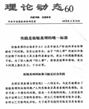 1978年5月10日,中央党校内部刊物《理论动态》发表经中央党校副校长胡耀邦审定的《实践是检验真理的唯一标准》一文。5月11日,《光明日报》以特约评论员名义公开发表这篇文章,新华社向全国转发。文章鲜明地提出:社会实践不仅是检验真理的标准,而且是唯一的标准。马克思主义的理论宝库不是一堆僵死不变的教条。“四人帮”强加在人们身上的精神枷锁还远没有完全打破,对“四人帮”设置的禁区“要敢于去触及,敢于去弄清是非”。文章明确提出,不能拿现成的公式去限制、宰割、剪裁无限丰富的飞速发展的革命实践,应该勇于研究新的实践中提出的新问题。文章一经发表便在广大干部群众中引起强烈反响,引发了关于真理标准问题的讨论。