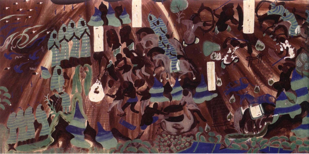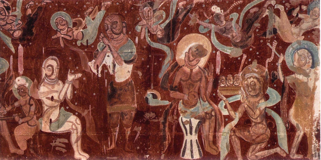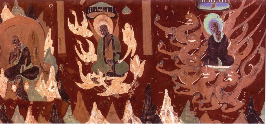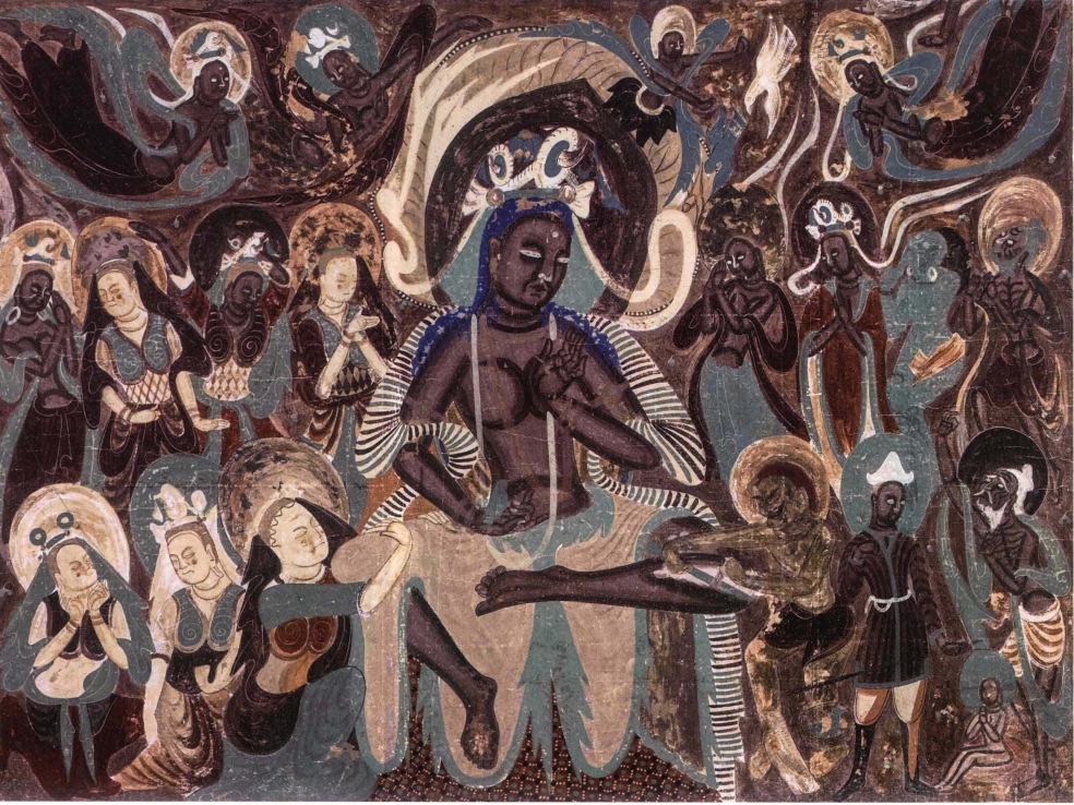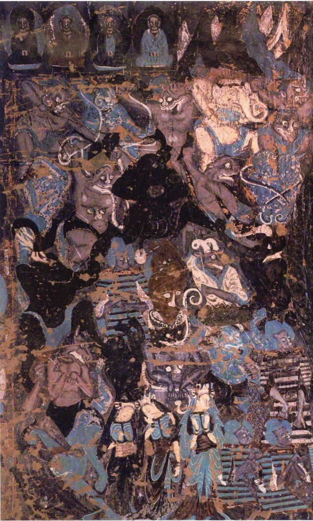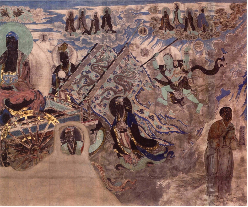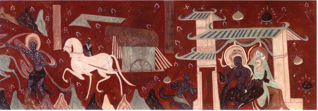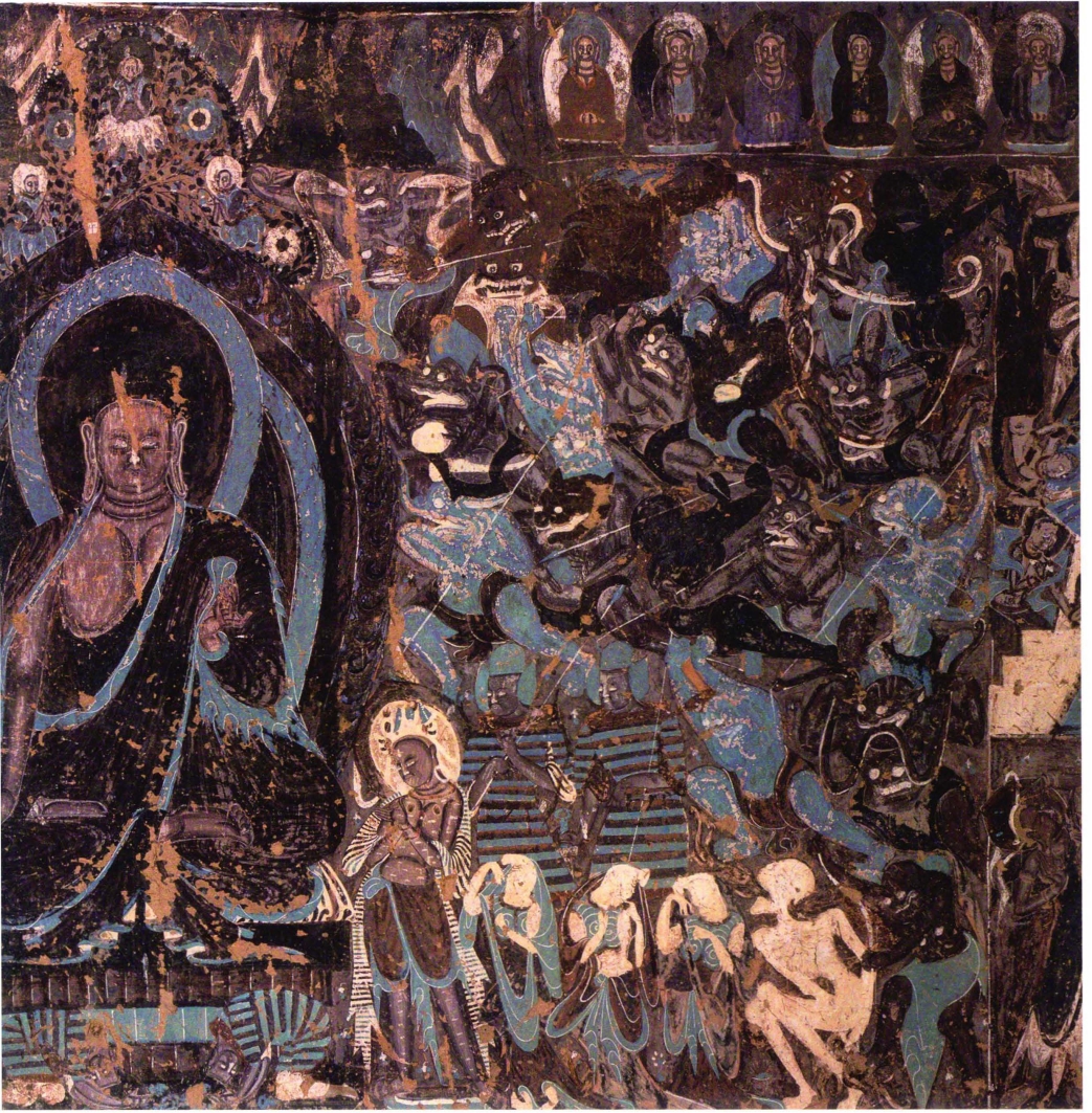 降魔变为释迦的诞生、降魔、成道、涅槃“四相”之一,表现的是释迦牟尼将成佛时,魔王波旬阻其成道的故事。这幅降魔变位于洞窟南壁,是敦煌石窟最早的一幅。佛居中结跏趺坐,左手执衣裙,右手作指地印,泰然自若。佛右侧拔剑者为魔王波旬,着盔甲,怒视释迦,身旁小儿为波旬之子,正从中劝阻。其身后三个女儿,着龟兹装,戴宝冠,披大巾,身穿半袖,外套背子,腰束长裙,搔首弄姿,作诸妖媚。释迦以神通力,将她们变为丑怪老妇,即左侧所绘。上部两侧画剑拔弩张、气势汹汹的魔军。释迦以手指地,大地震动,群魔头脚颠倒,于恐惧中跪地投降,形象生动,想象力丰富。