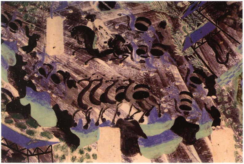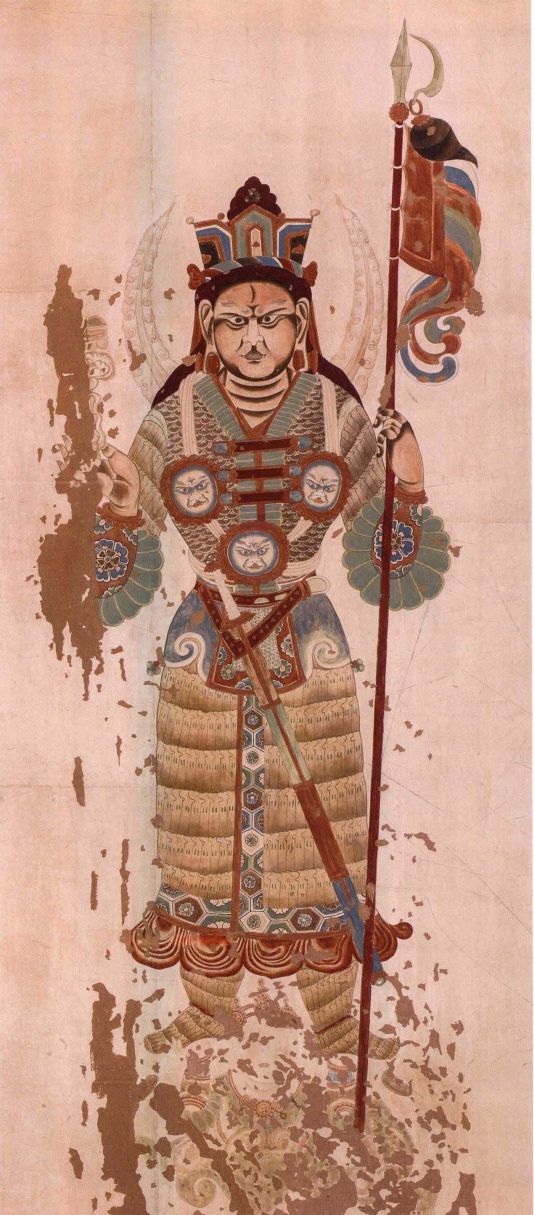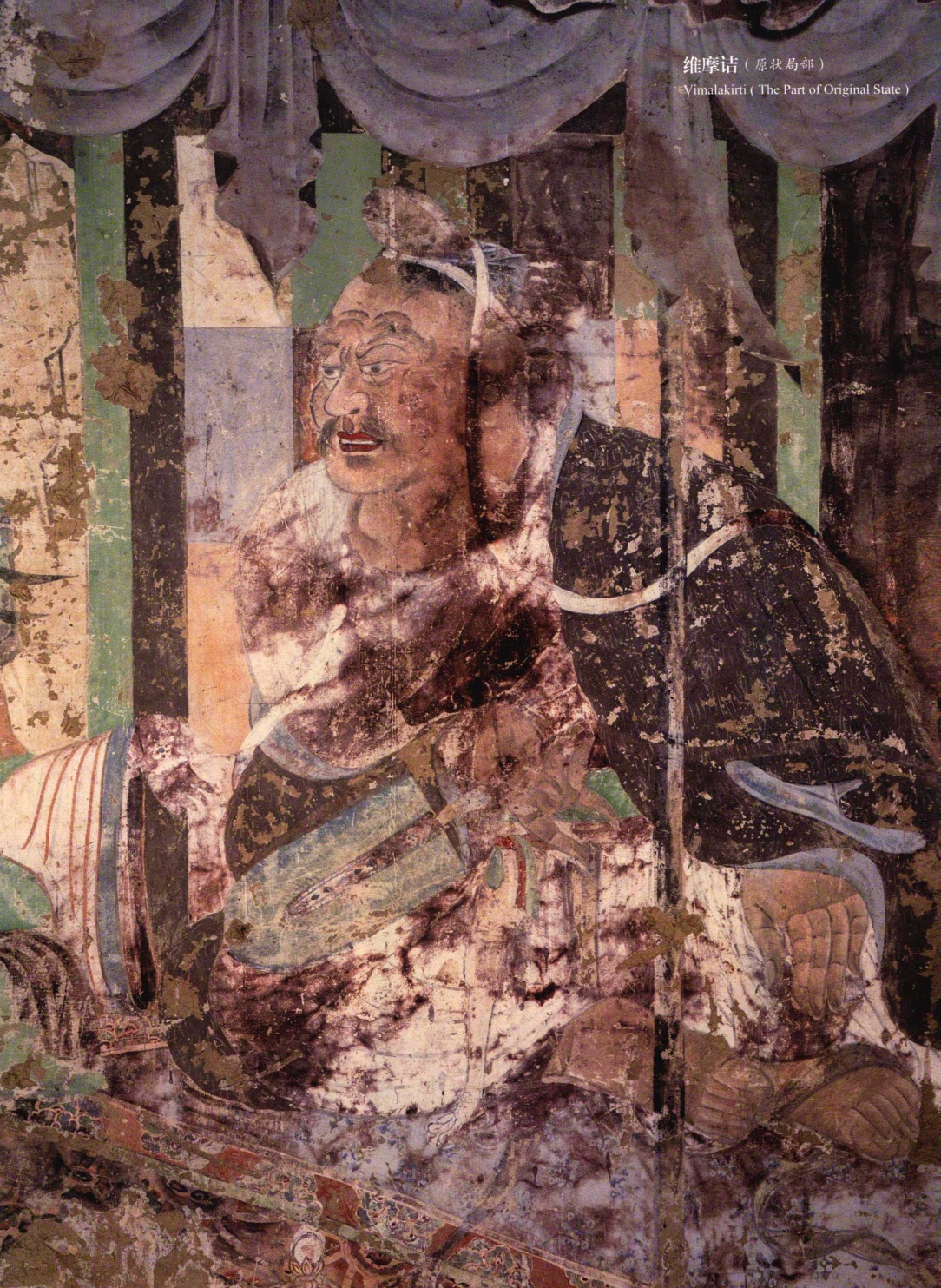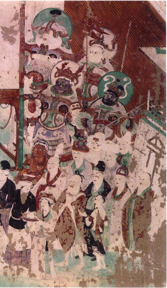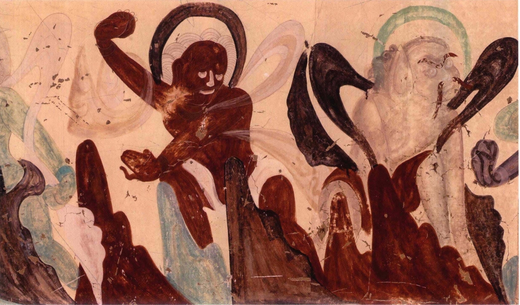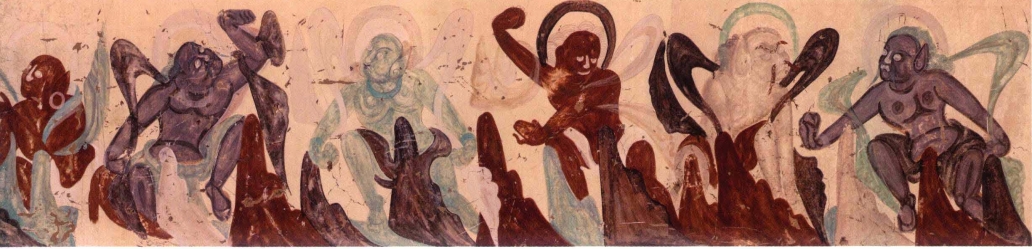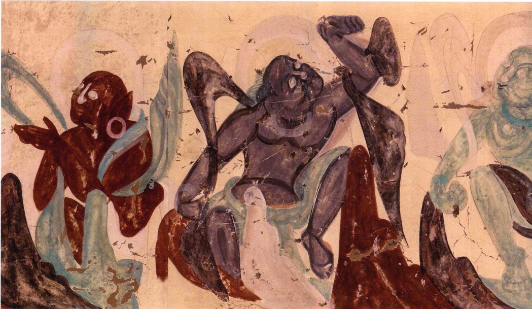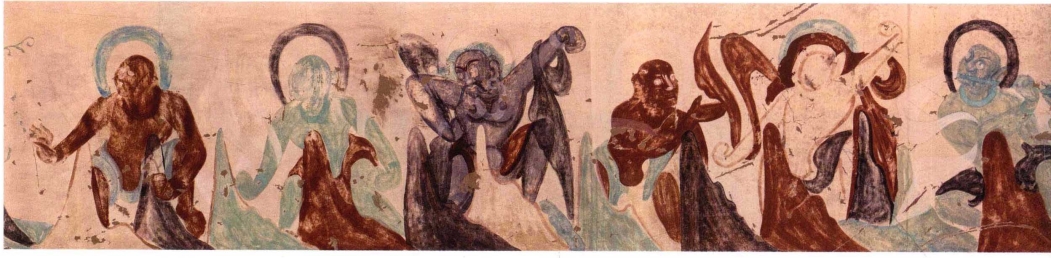 金刚力士是佛教的护法神,一般画于洞窟四壁下方和中心柱下部四周山丘之间。这是南壁力士中的一部分,它与上部的伎乐上下呼应,形成鲜明对比,极富装饰意味。