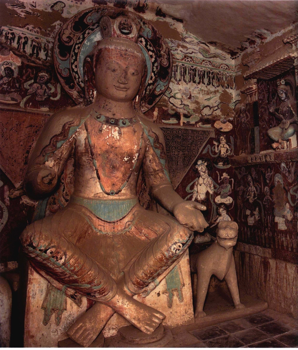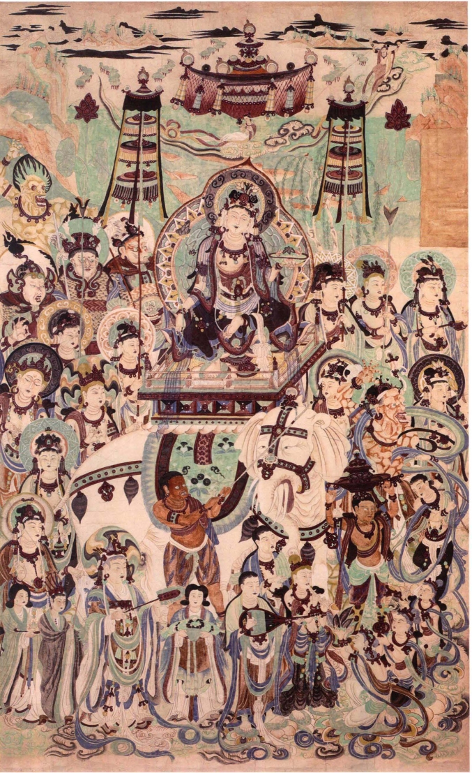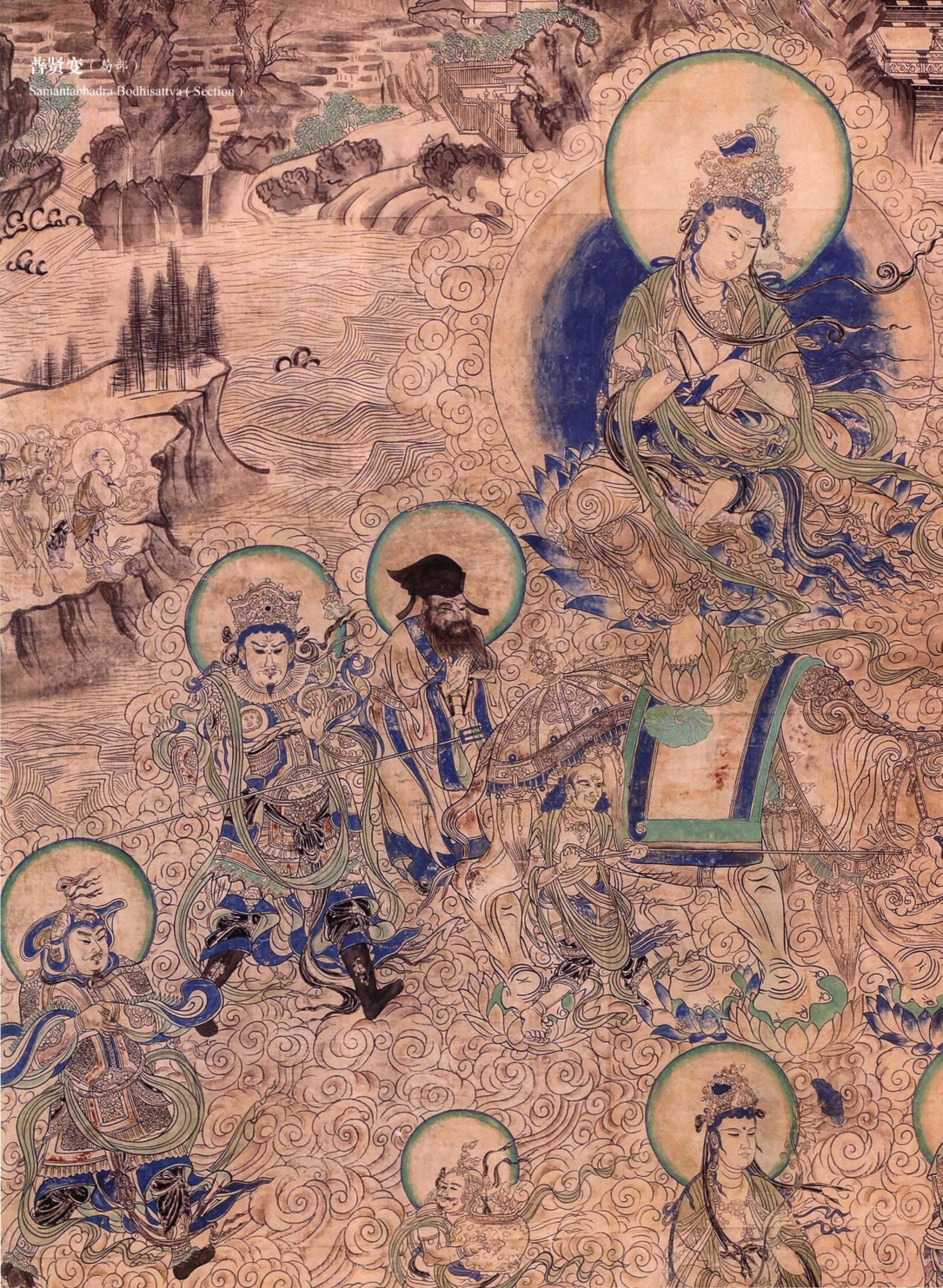 这幅普贤变位于西壁门南,与门北文殊变相对,结构、画风也相同。普贤菩萨乘象,舒右腿半跏坐于莲座上,冠带、披帛、璎珞随风飘扬,手执经书,俯视下界,神态悲悯。众中有菩萨、天王、罗汉和道教的天人,环绕普贤,乘云浮游于大海之上。上方天际有仙山琼阁,南侧突出崖岸,画取经僧玄奘与猴行者牵驮经白马,向菩萨合十致礼,说明当时流传的三藏取经故事也成为佛教壁画描绘的题材。