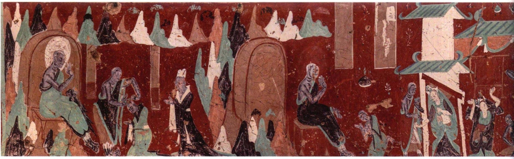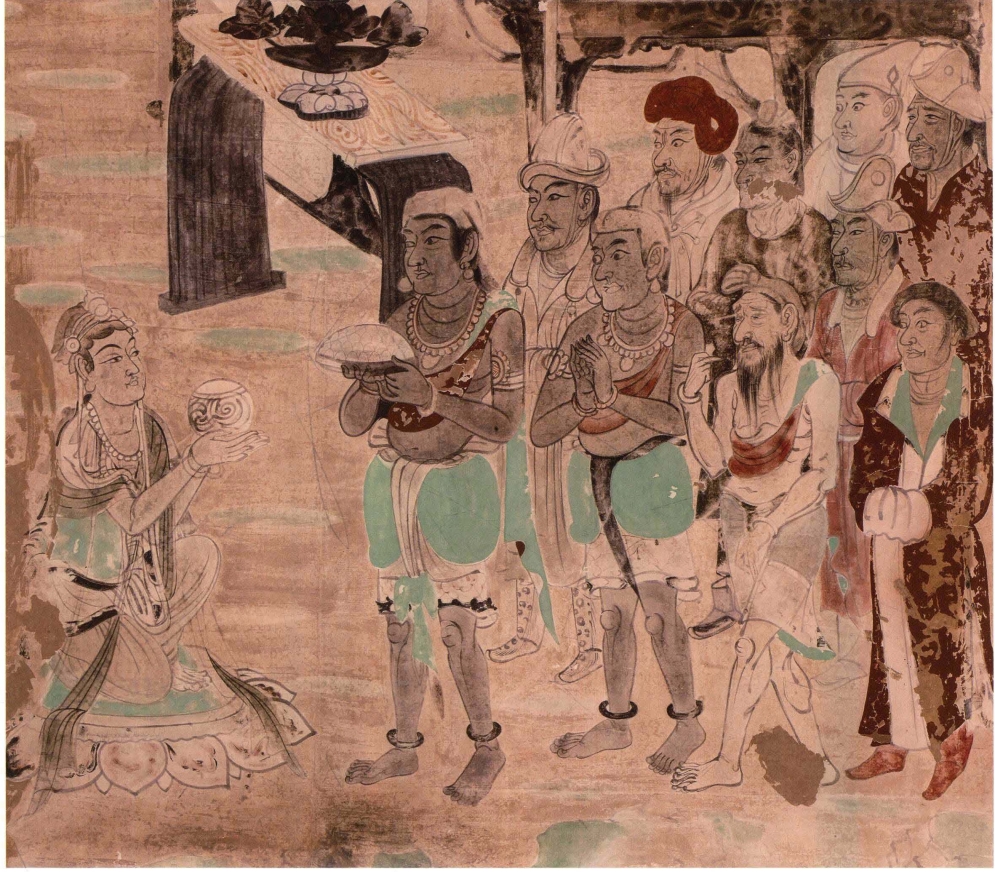 尸毗王本生讲:有鹰逐鸽,鸽逃至尸毗王处,鹰向尸毗王言,若不食鸽,将被饿死,尸毗王为了两全其生,乃割己肉赎鸽,王身肉将尽,其重犹不如鸽,遂举身坐秤盘内。画面以高大的尸毗王居中,上为鹰逐鸽,左为眷属惊惧哀劝,右为臣民敬仰赞叹,右下一人着胡服持秤称肉,画面主题突出,情节完整。