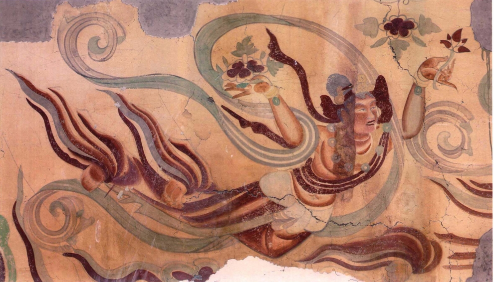 这身飞天头梳双髻,手布天花,帛带飞扬,姿态矫健活泼,双颊略施淡彩晕染,稚气天真,富有朝气。由于绘于窟外崖上,更显自然天成,别具一格。