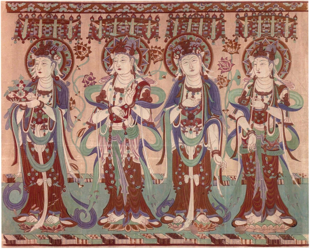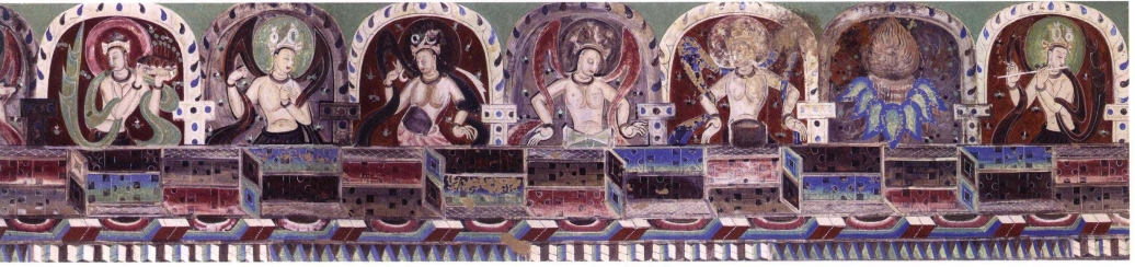 画面绘供养菩萨四身,顶上有华盖,头戴宝冠,身着璎珞,披帛飞扬,双手或捧花盘,或执莲花,下着长裙,足踏莲台。此铺壁画是西夏早期的作品,造型、衣饰、风格等方面均与北宋一脉相承。色彩热烈明快,绘工细致,是西夏壁画的代表作品之一。