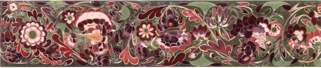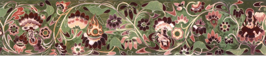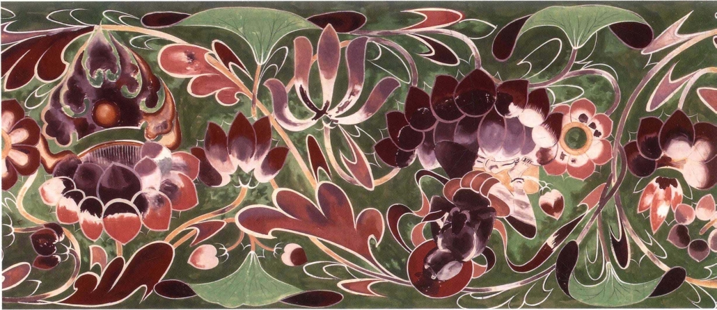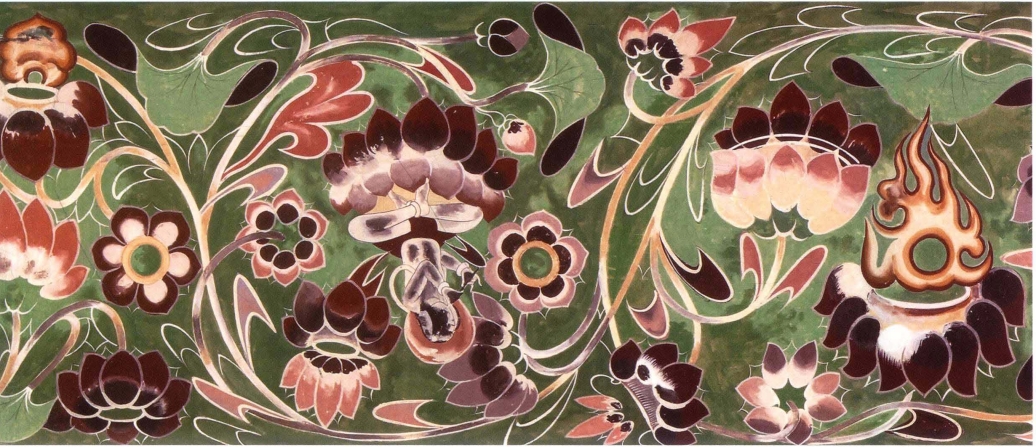 这幅莲花伎乐边饰全长约10米,画在横跨洞窟窟顶的人字披中间的梁檩上,是隋代罕见的大型边饰之一。图案花形丰硕,蓓蕾与枝蔓穿插蔓延。化生童子手执乐器高坐莲台,清歌奏乐。花叶统一于浑厚畅达的白色线纹中,画面极具韵律感。