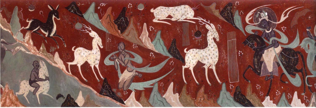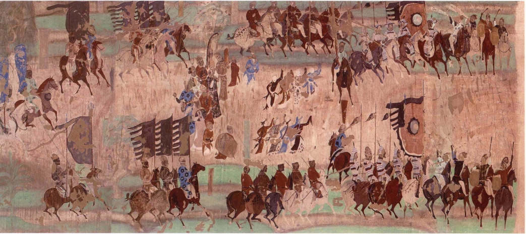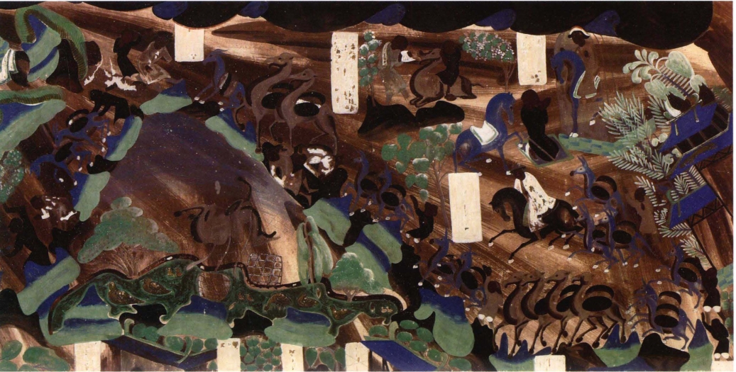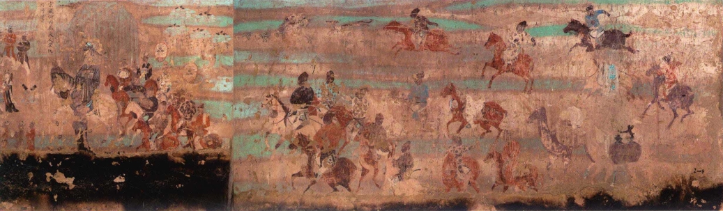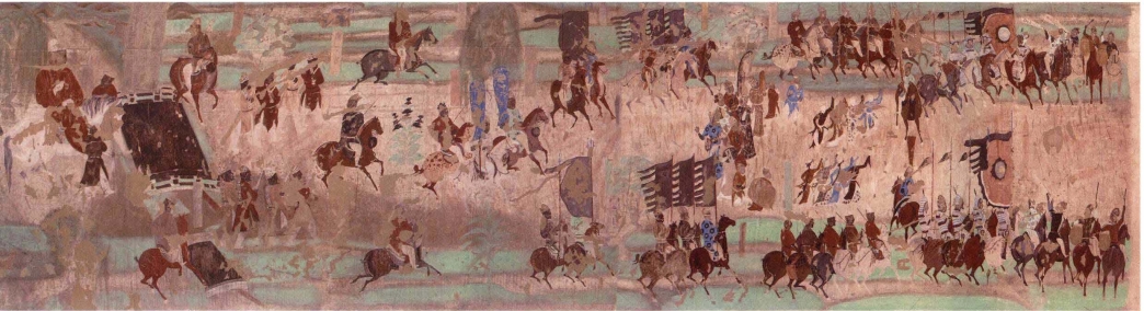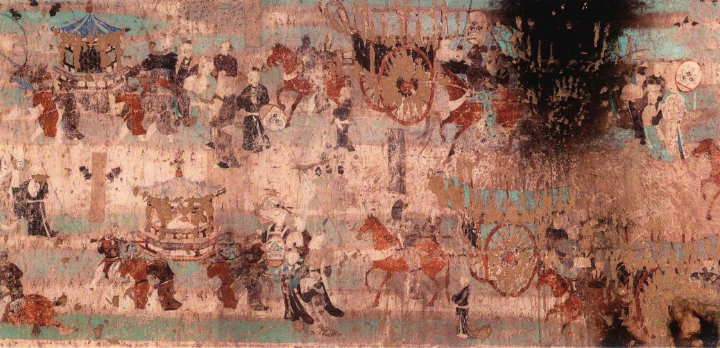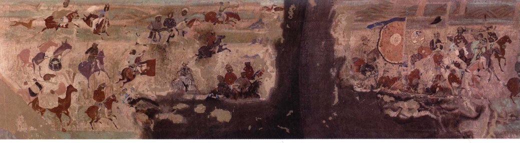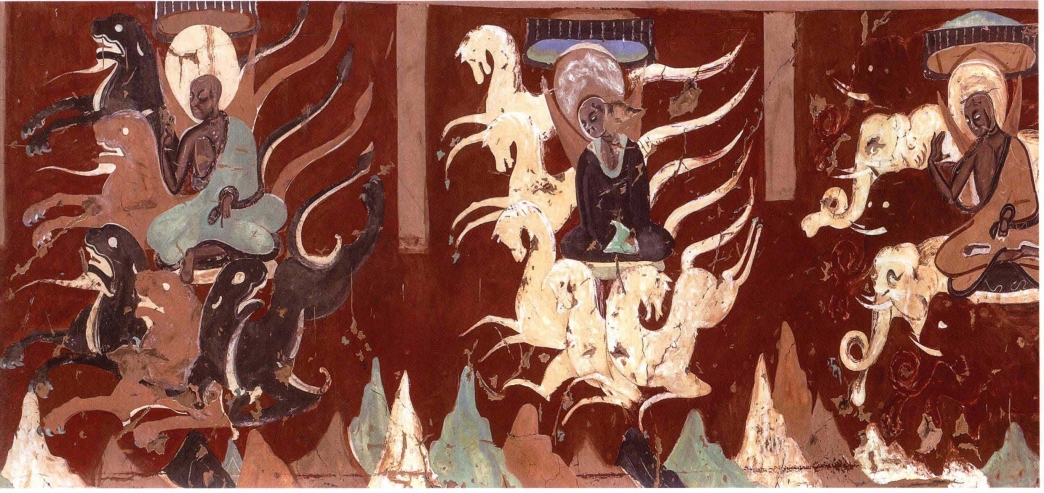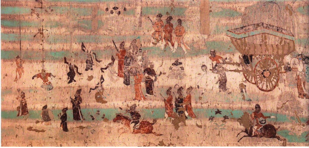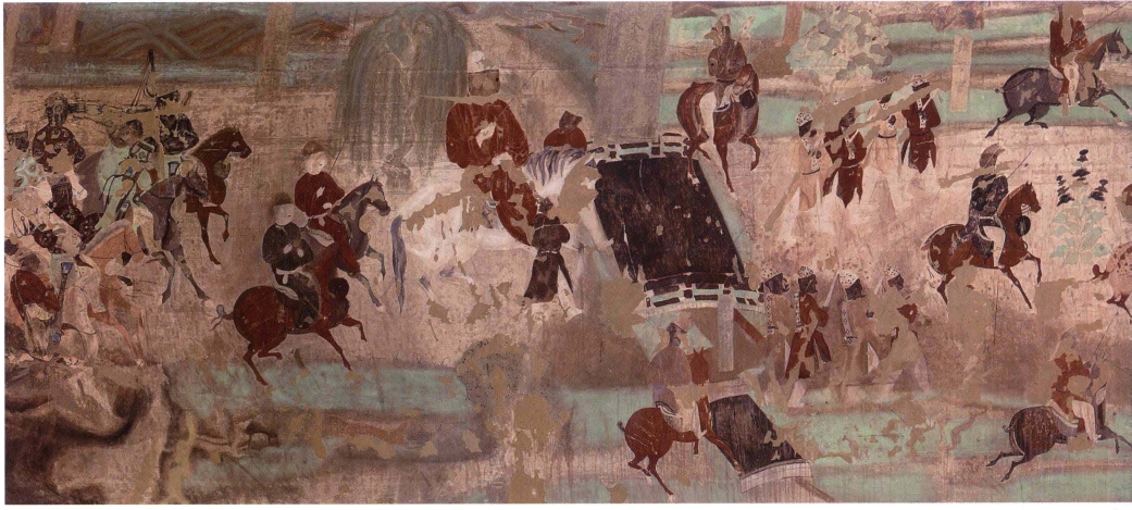佛传故事画之一。讲述佛祖为太子时,出游四门,见老人、病人、死人及僧人,感生老病死,人生无常之苦,起意出家修行。这幅壁画表现太子骑马出四城门遇老人、僧人的情节。画面为汉晋传统形式的横卷连环画,平列构图,人物形象、服饰及晕染则明显受西域艺术的影响。