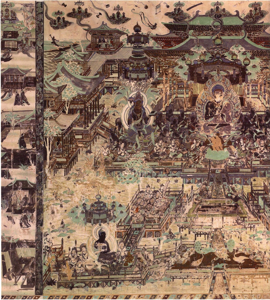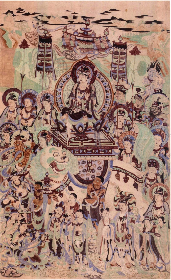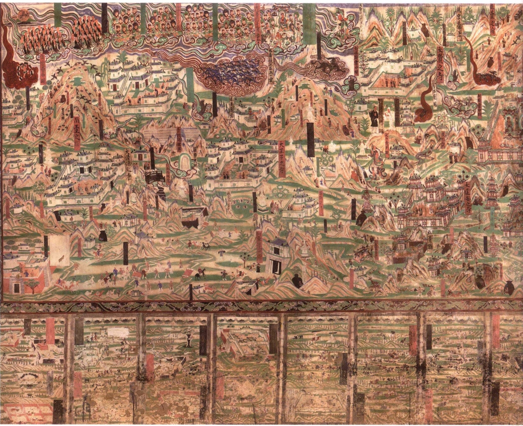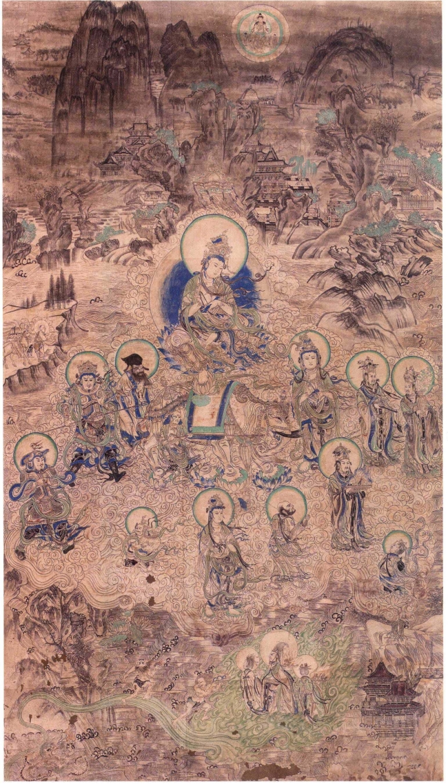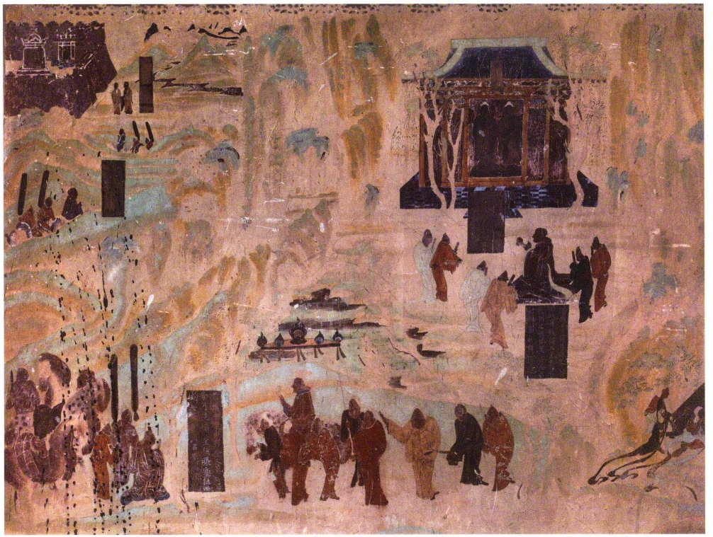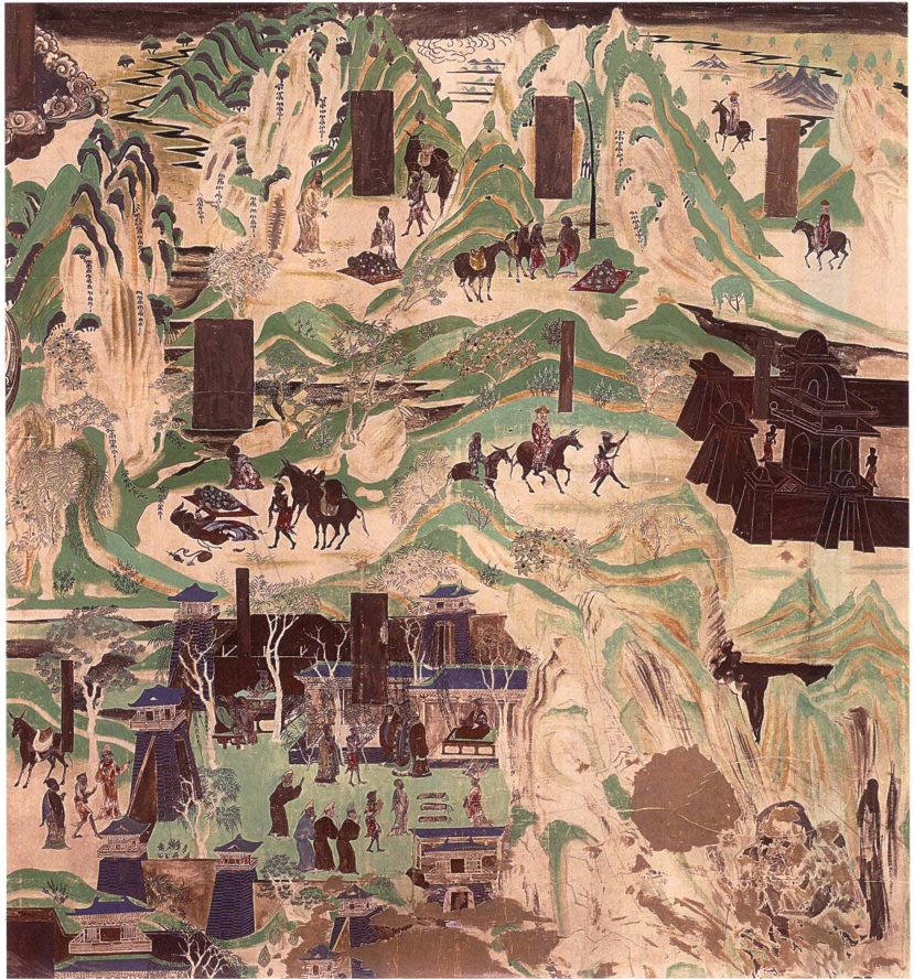 五台山据传是文殊菩萨居住的胜境,北魏以来就深受佛徒景仰。唐长庆四年(公元824年),吐蕃遣使向唐王朝求五台山图,五台山图始传入河西,出现于敦煌壁画。这铺五台山全图,横贯洞窟整个正壁,既是一幅佛教史迹画,又是一幅山水人物画,还是一幅全景式构图的历史地图。