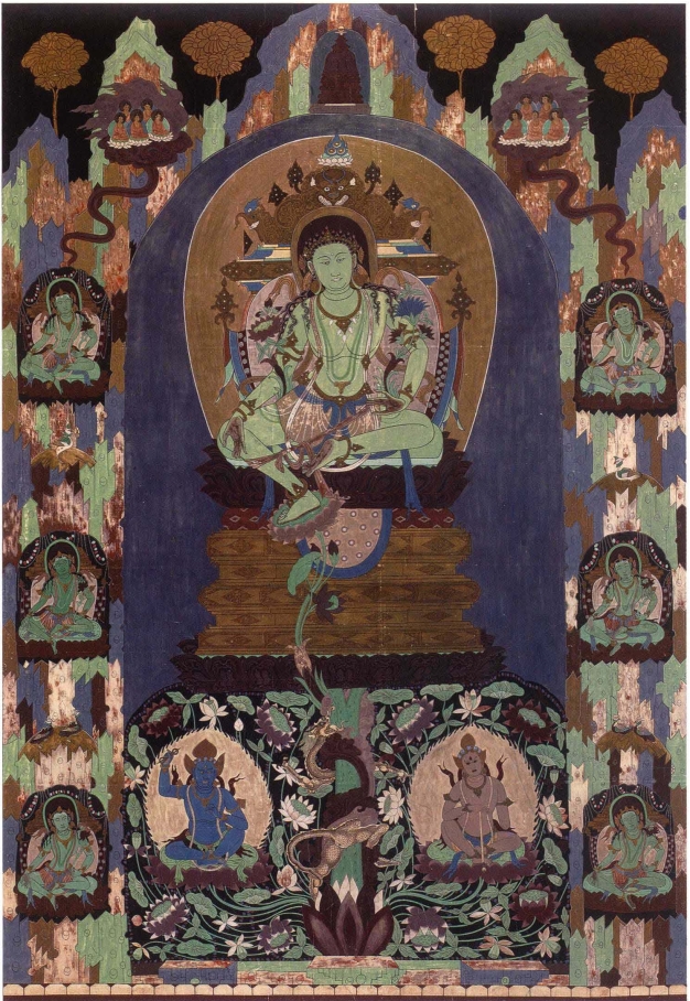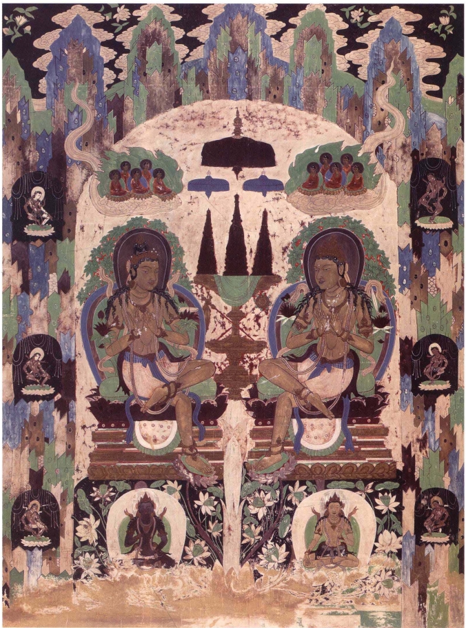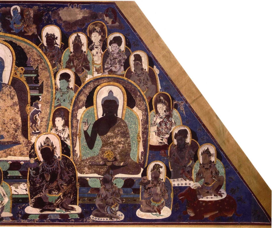 元代莫高窟壁画中出现了藏传佛教的题材与形式,集中表现在第465窟,内容组合及颜料用色上均较为独特。壁画绘于窟顶东披,为东方阿閦佛说法图一铺。图中主尊为一大佛,蓝身,两侧二身较小的佛,完整的组合应是居住在东方的阿閦佛的身、口、意三身。周围环绕诸菩萨、眷属。在佛像造型上,尖肉髻,袒右肩,细腰,背光均绘成门券形,为藏传佛教特有的表现方式。