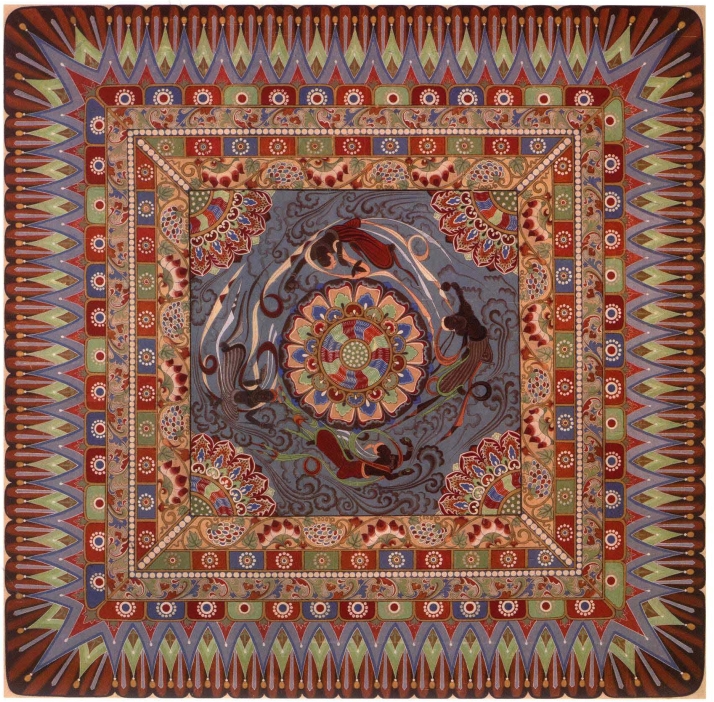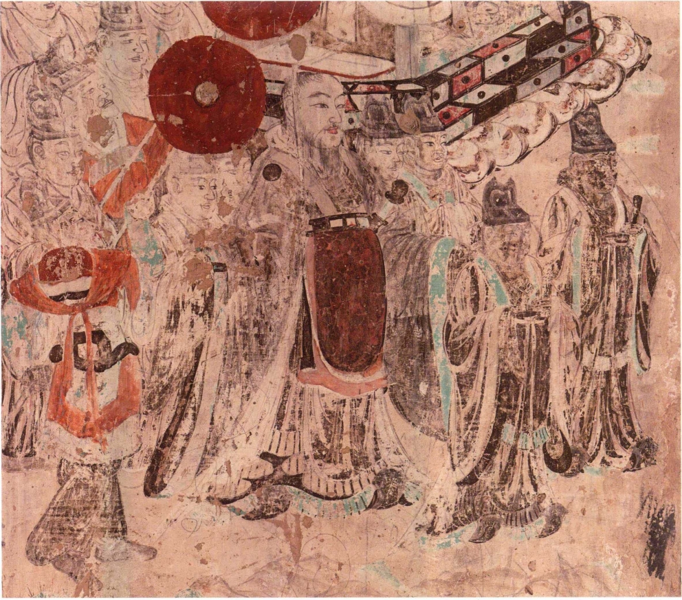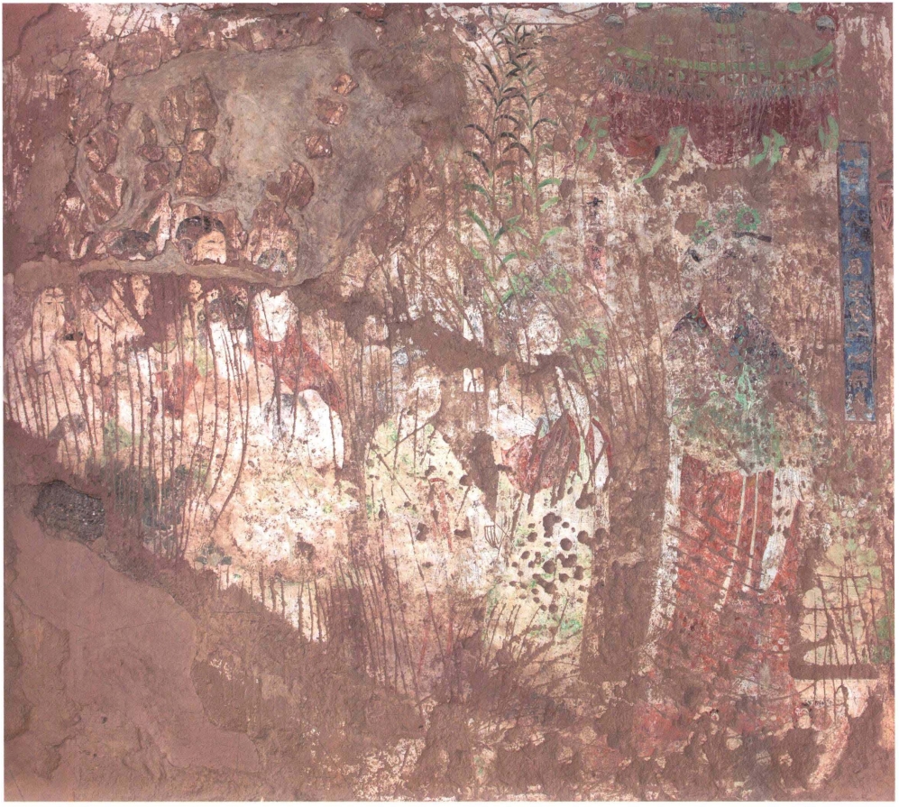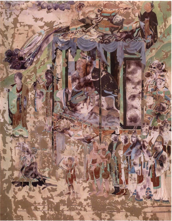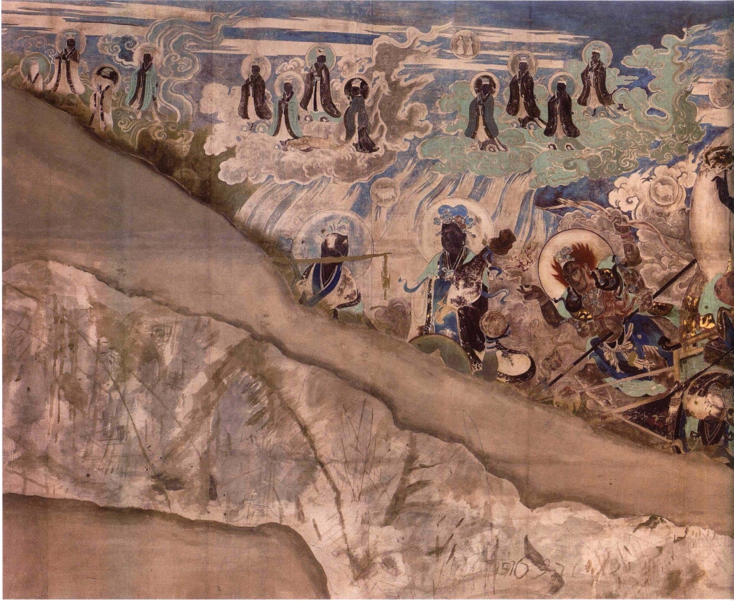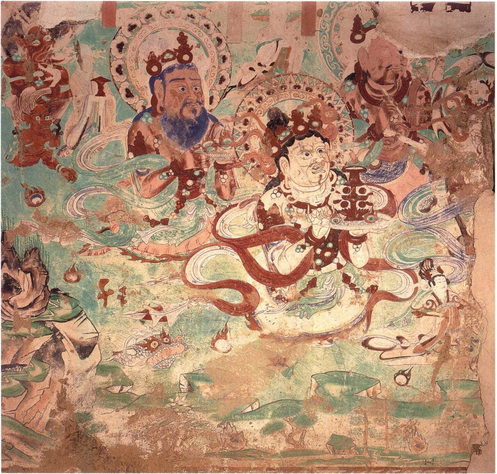 龙为佛教天龙八部护法神众之一。壁画中龙王手捧供盘,盘中供瓶、宝珠供养,其眷属、龙子、龙女、夜叉等随其前后,拥护行进在波涛汹涌的大海之上。此图笔法流畅,劲健有力,色彩协调,为五代时期难得的佳品之一。