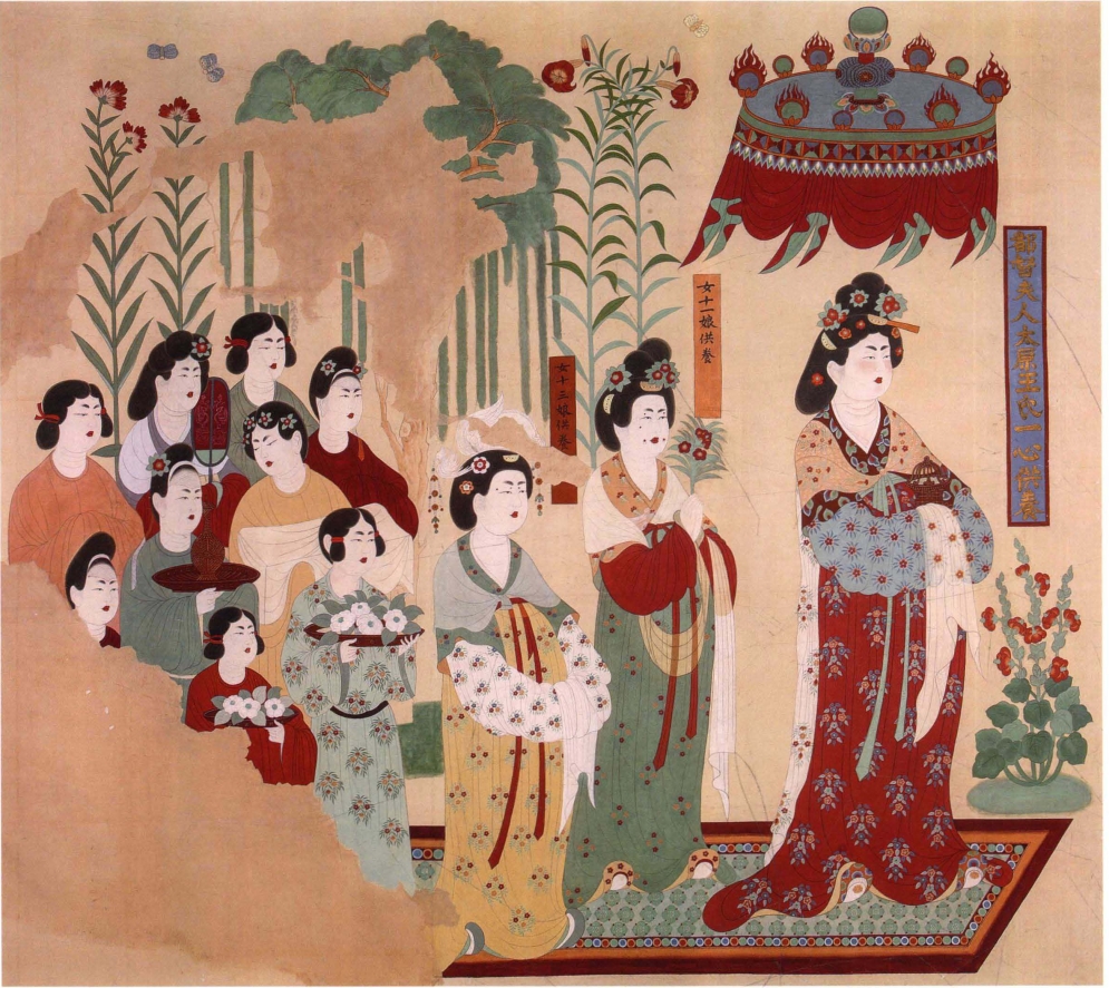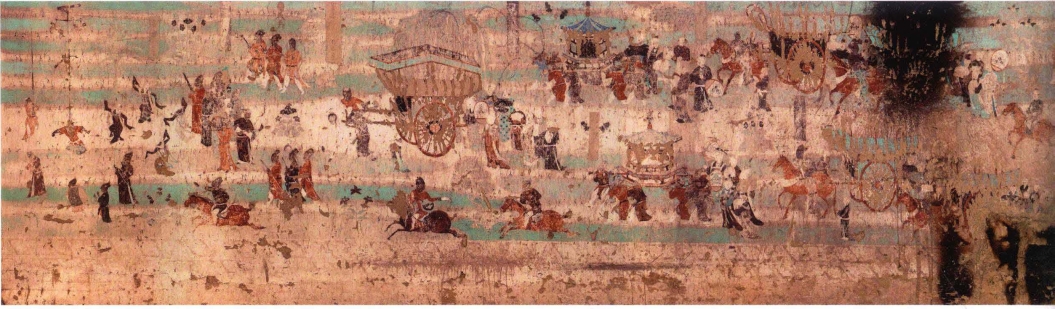 此壁画绘于洞窟北壁及与其相联的东壁北侧之下部。宋氏是张议潮的夫人,此图为宋氏夫人春游画卷。全画可分三个部分:杂技舞乐部分,绘杂技表演及乐工、舞女等;主体部分,绘宋国夫人及出行车马、肩舆、护卫、侍从婢女、乐工等;饮食供给部分。本画气氛轻松欢快,与《河西节度使张议潮统军出行图》之肃穆严谨,恰成对比,可称敦煌壁画出行图中之双璧。