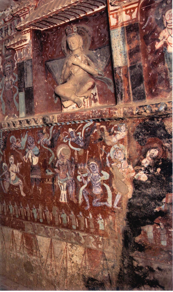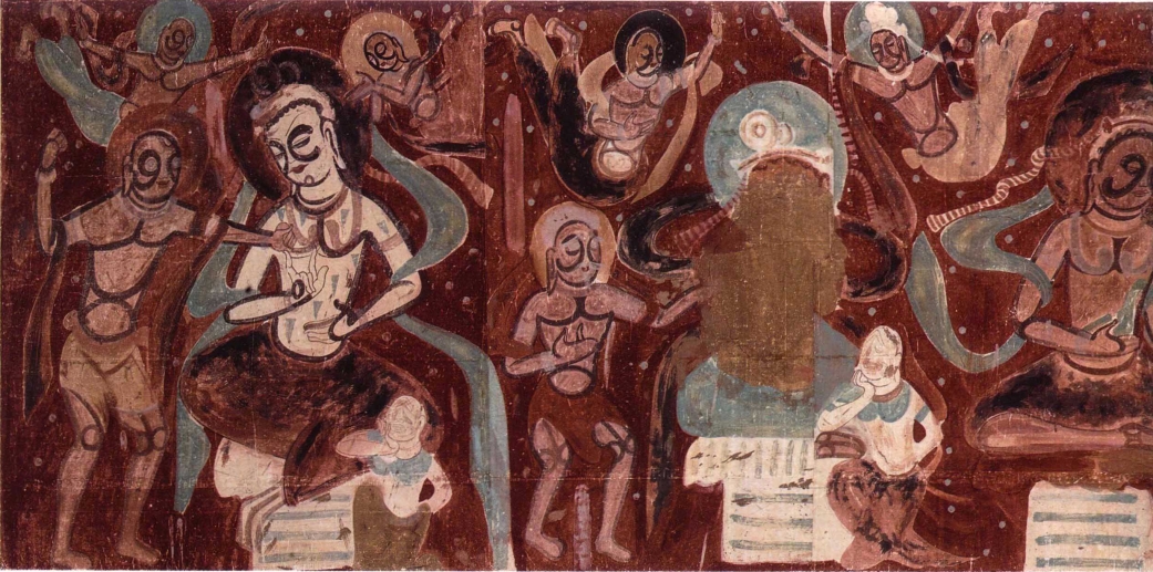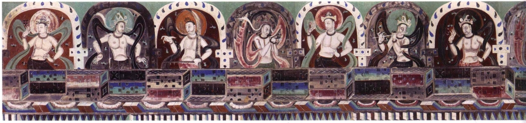 天宫伎乐是敦煌早期壁画常见的题材,因描述天人置身于天宫内奏乐歌舞而得名。此天宫伎乐图位于洞窟墙壁的上部。天人在天宫栏墙内露出大半身,头戴宝冠,上身赤裸,身披巾,腰系裙,有的在舞蹈,有的在奏乐,表现出天宫的欢乐气氛。画中的栏墙以青、绿色和红、黑褐色晕染,图案清晰,整体色彩保存完好。众天人的造型带有浓厚的西域风格,是研究中国古代乐器和舞蹈造型的珍贵图像资料。