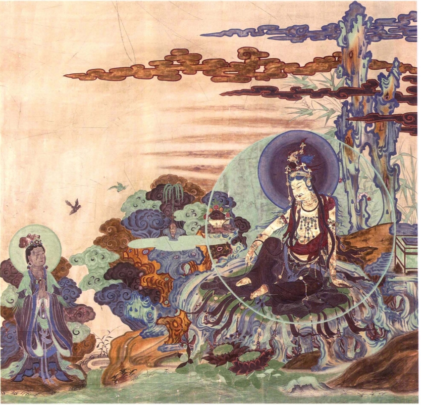 水月观音为三十三观音之一。在敦煌壁画中,始见于五代,到西夏晚期成为鸿篇巨制。这幅水月观音,与另一幅同样精美的水月观音分布于西壁门南北两侧。画面上南海茫茫,景色寥廓,在透明的巨大圆光里,显现出头戴金冠,长发披肩,佩饰璎珞环钏,腰系长裙的观音菩萨。对面一人云中而来,双手合十礼拜观音。整个画面有动有静,绿色与蓝青色的运用,达到出神入化的境地。不仅仅是一幅杰出的人物画,也是一幅精美的山水风景画。